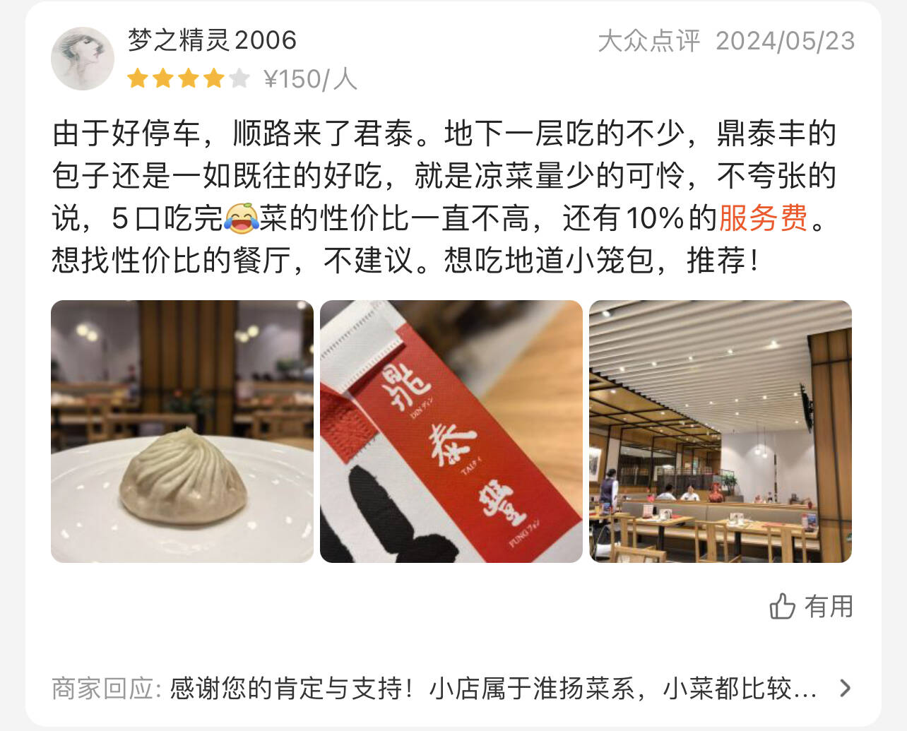 对于不少客人来讲,除了定价高,10%的服务费也经常成为鼎泰丰家的槽点。2023年,餐饮行业降价潮来袭,鼎泰丰属于高端餐饮。据大众点评,北京地区门店的人均价格在150元上下,山东两家门店人均价格相对较低,青岛海信广场店为133元,嘉年华·海信广场VILLAGE店为98元,对于一顿小笼包、胡辣汤、蛋炒饭来讲,这价格还是很多人接受不了。在部分门店评价中还可以看到,加收了服务费而服务不到位,也更让一些食客吐槽。
