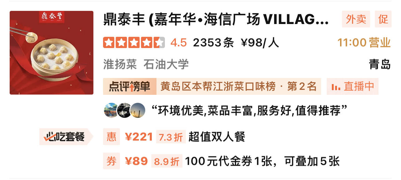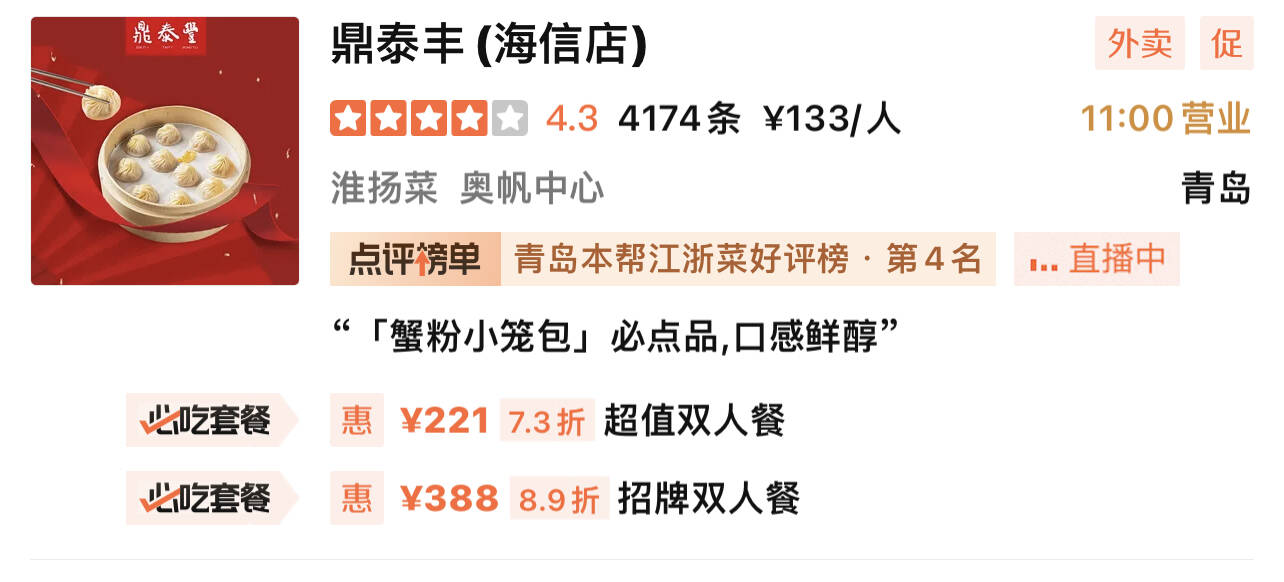 山东两家鼎泰丰均在青岛,位于黄岛区的嘉年华·海信广场VILLAGE店和市南区的海信广场店,两家店分别在2016年和2021年开业。《生活帮》记者致电询问两家门店歇业时间,均得到回复。海信广场店服务人员表示,目前接到的通知是9月30日前可以正常用餐,后续还没有正式通知。嘉年华·海信广场VILLAGE店店长也表示,目前是以最开始的版本,通知所有顾客尽量在9月30日前用餐,因为有一些属于公司和商场的沟通,商场同意的话就是9月30日闭店。
