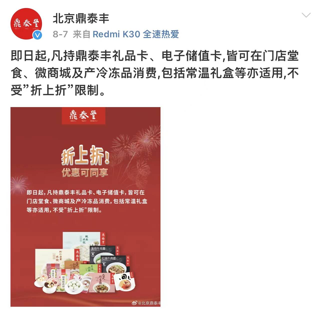 早在8月7日,北京鼎泰丰促消费的意图就显露,当天其在微博平台上发布了一项措施,称即日起,凡持鼎泰丰礼品卡、电子储值卡,皆可在门店堂食、微商城及产冷冻品消费,包括常温礼盒等亦试用,不受“折上折”限制。8月26日的公告中,北京鼎泰丰表示,将妥善处理员工经济补偿金与安置事宜,并依法保障储值卡会员的合法权益。
