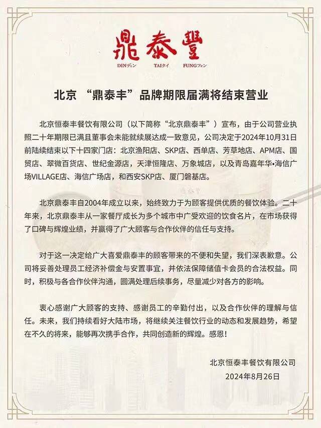8月26日,“鼎泰丰DTF”微信公众号发文称,北京“鼎泰丰”餐饮品牌期限届满将结束营业。公司决定于2024年10月31日前陆续结束14家门店的营业,山东青岛嘉年华·海信广场VILLAGE店、海信广场店包含在内。消息一出,不少网友表示遗憾,“再不吐槽服务费了,希望别关,超级爱吃的小包子”。也有人发出疑问,“可惜了,吃了十几年了,为什么说关就关了呢?”