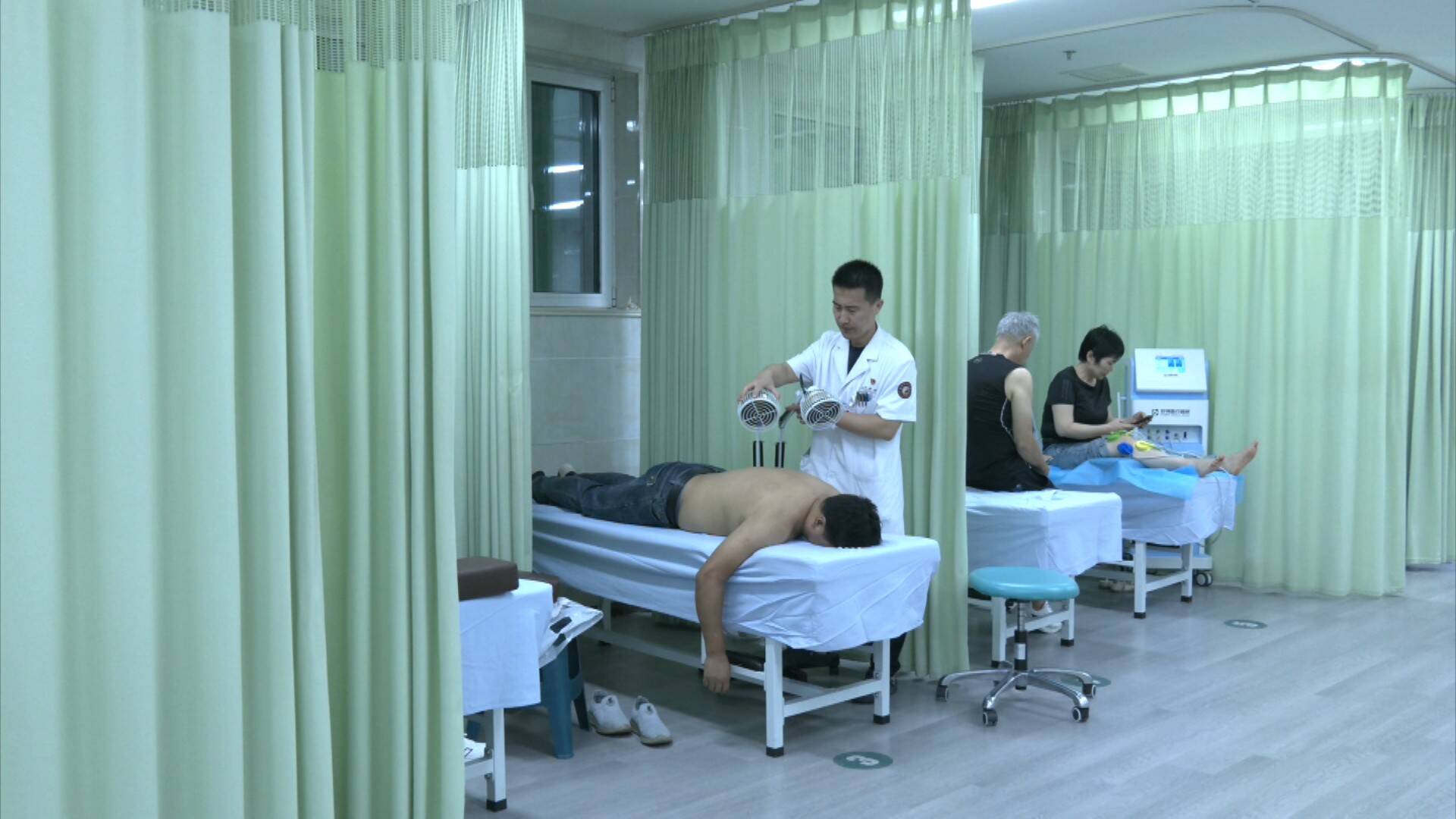 晚上7点,胶州市中医医院的康复科门诊大厅里,不少患者正在接受针灸、推拿等中医治疗。市民郭金枝腿部受伤,每天利用夜间延时服务时间来医院进行中医康复治疗,恢复情况良好。