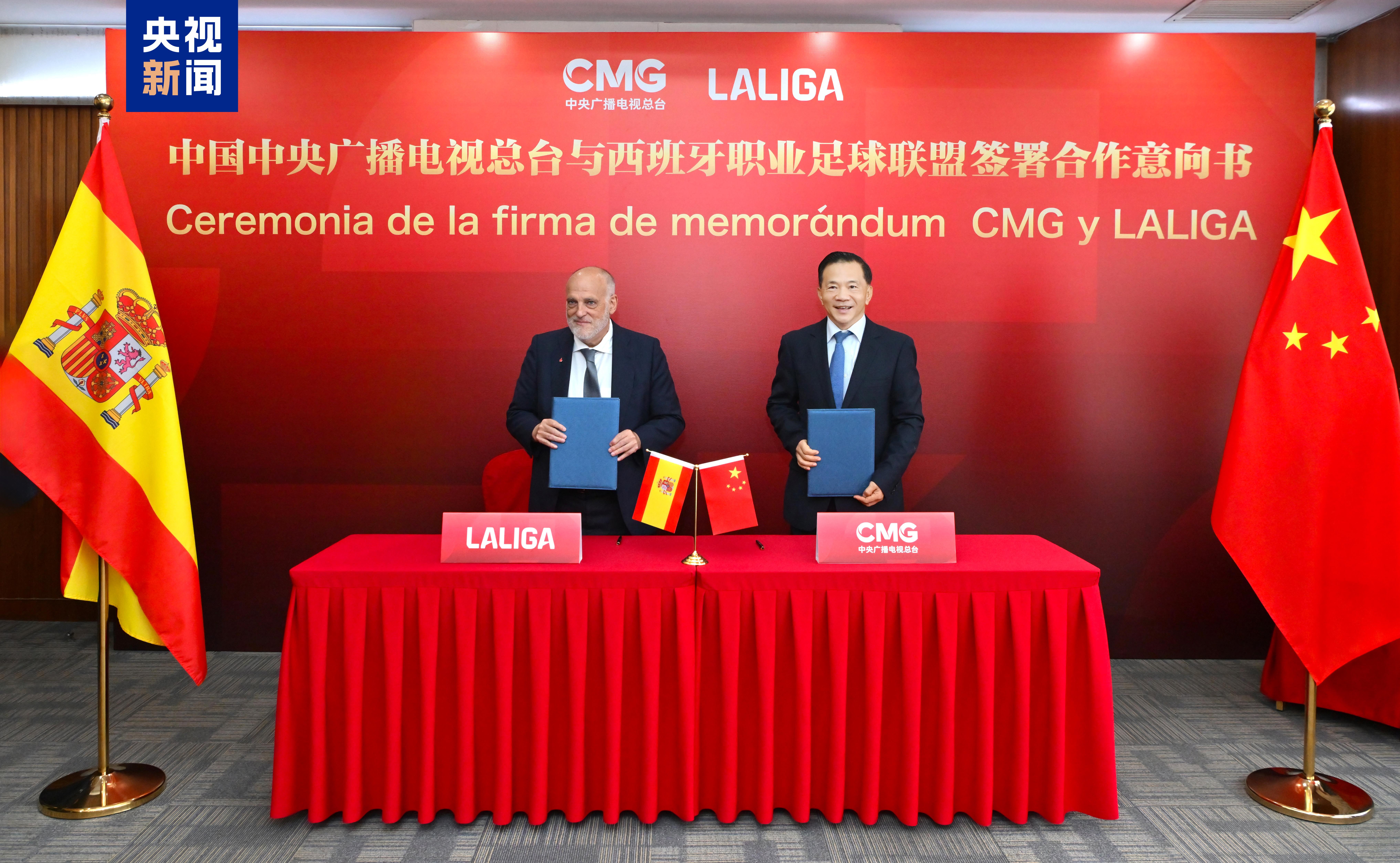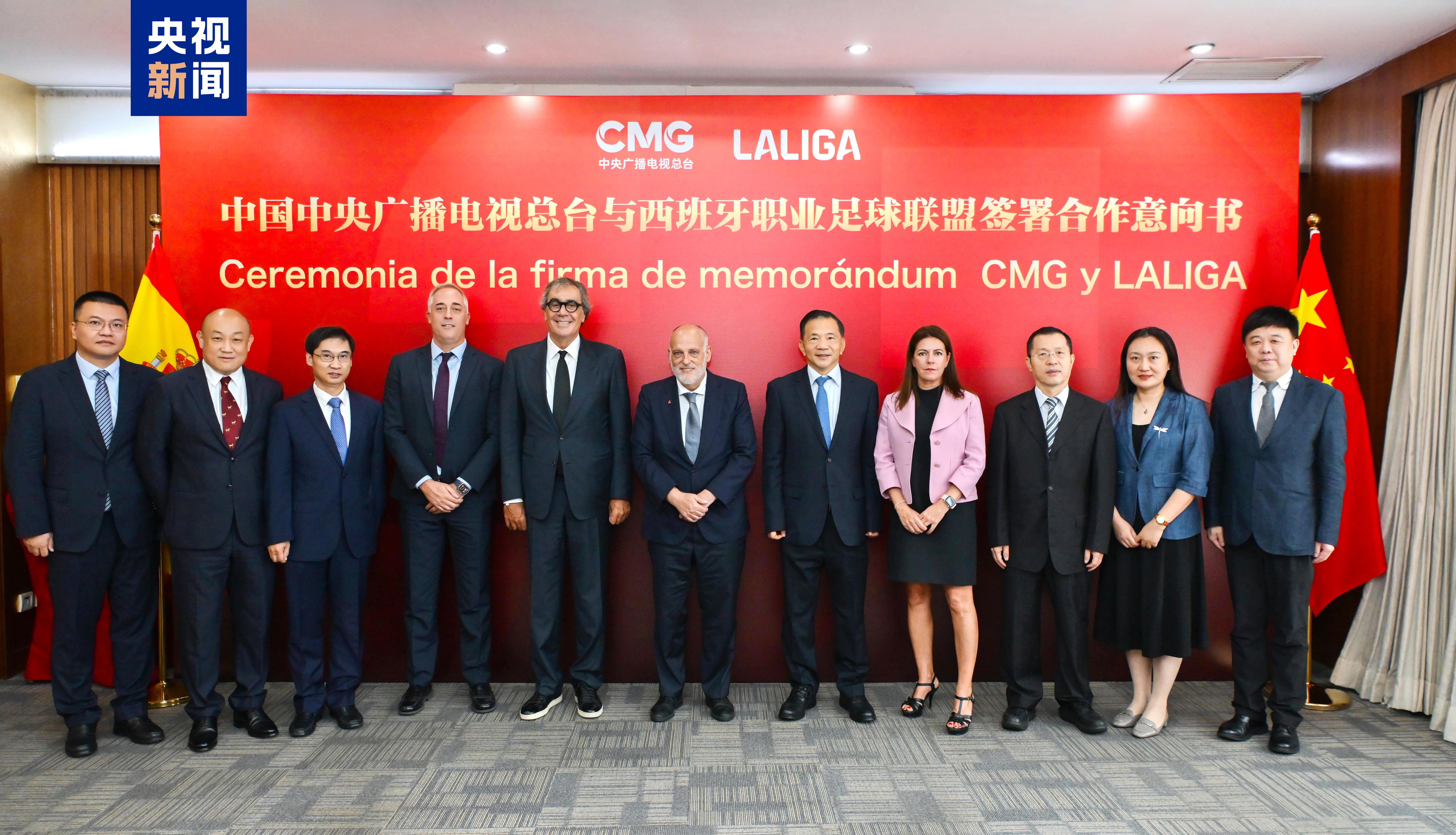 中宣部副部长、中央广播电视总台台长慎海雄和西班牙职业足球联盟主席特巴斯当天在北京签署了合作意向书。根据协议,总台将拥有新周期西甲联赛电视及新媒体权利,双方还就推动行业交流、促进青少年足球发展等方面达成合作意向。