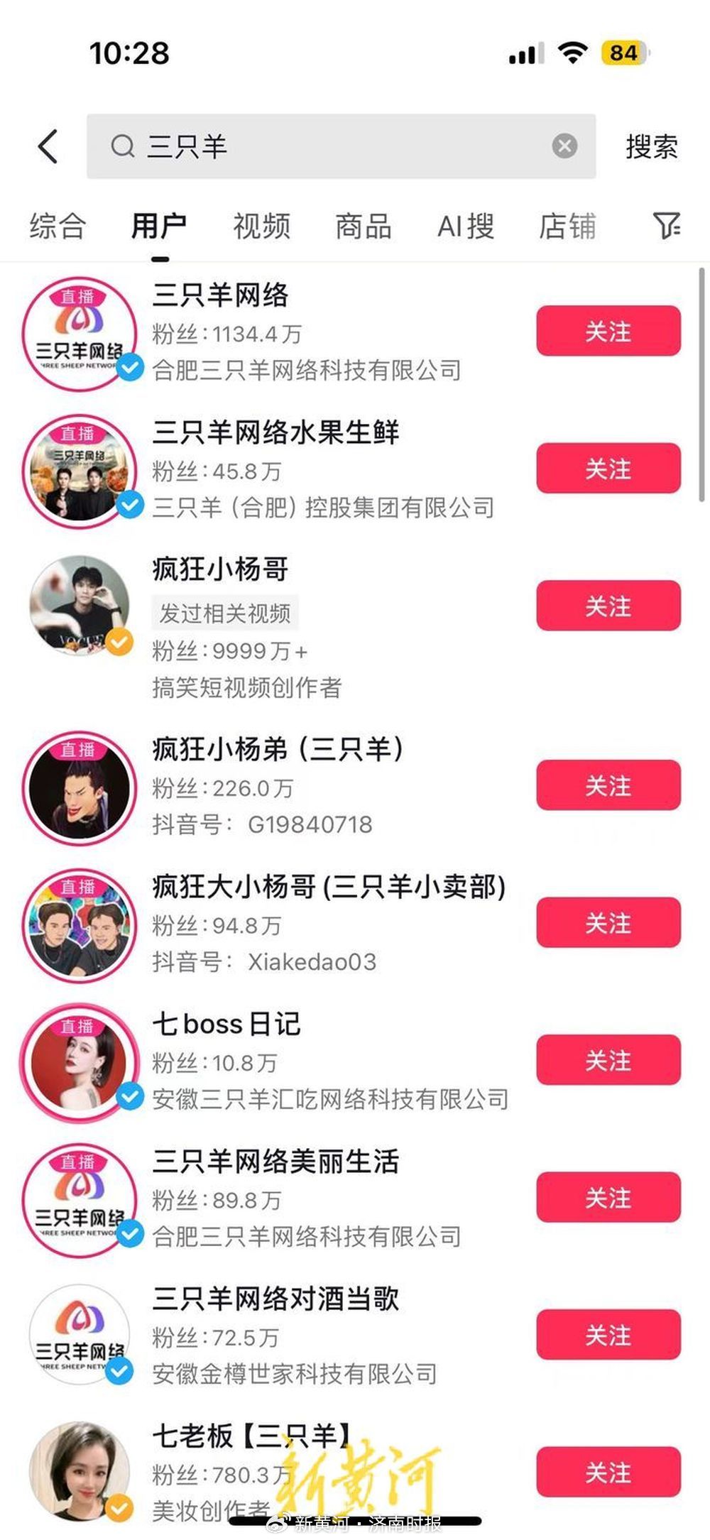 “三只羊网络”和“三只羊网络美丽生活”账号企业认证为合肥三只羊网络科技有限公司。“三只羊网络水果生鲜”认证为三只羊(合肥)控股集团有限公司。上述两家公司法定代表人为三只羊创始人张庆杨。