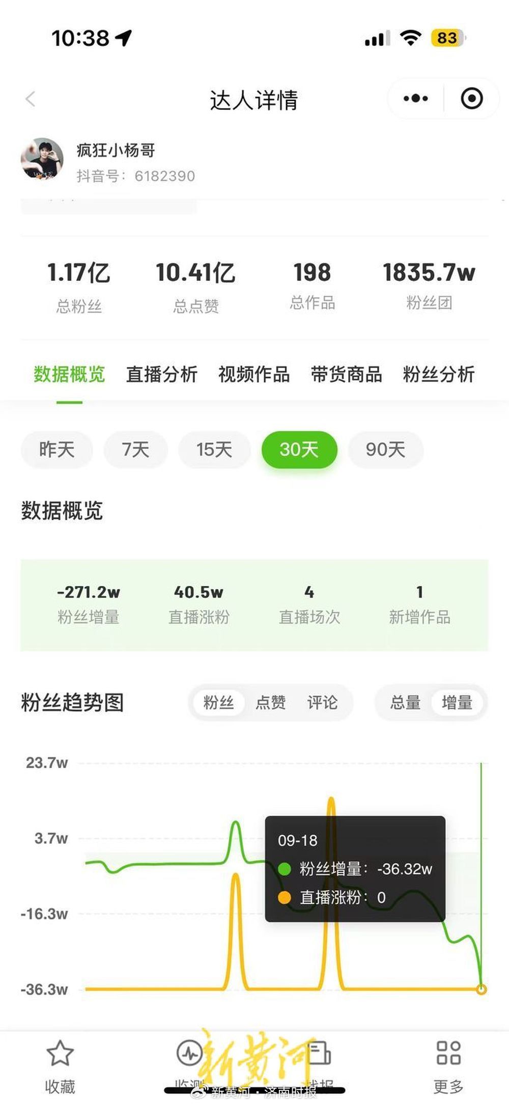三只羊创始人张庆杨、张开杨并未对此作出回应,“疯狂小杨哥”账号持续失去粉丝。飞瓜数据显示,9月18日,“疯狂小杨哥” 掉粉36.32万。最近30天,该账号已经失去粉丝271万,目前总粉丝量1.17亿。