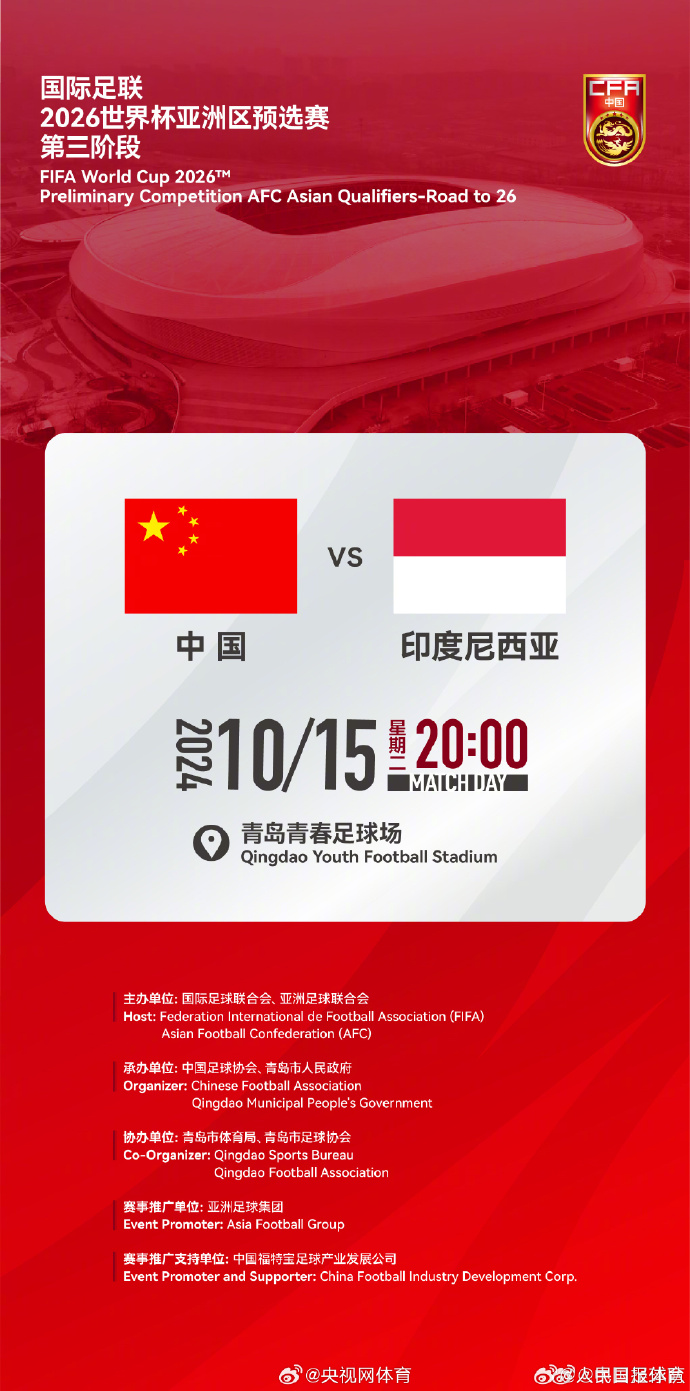 北京时间8月23日,中国足球队官方宣布,国际足联2026世界杯亚洲区预选赛第三阶段,中国队VS印度尼西亚队的比赛将于2024年10月15日20:00在青岛青春足球场打响。