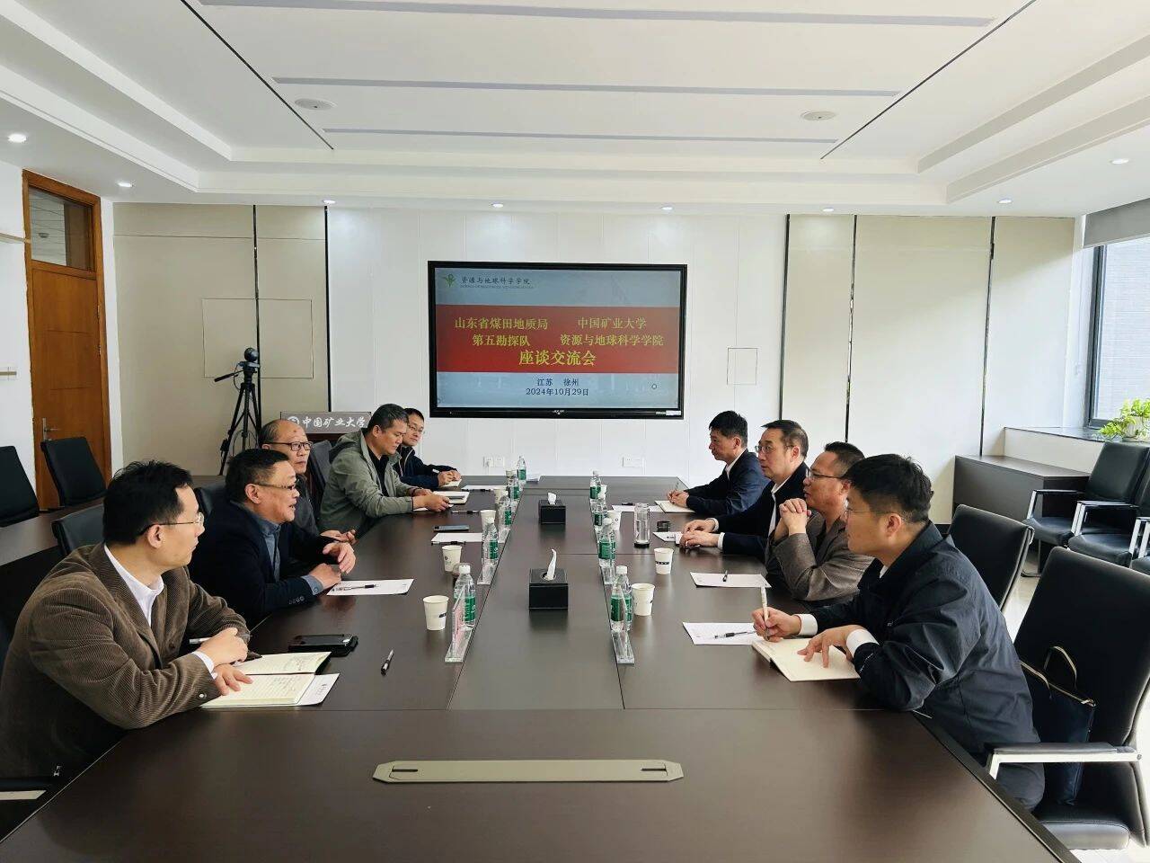 10月29日,山东省煤田地质局五队党委书记、队长陶会林一行前往中国矿业大学资源与地球科学学院座谈交流。学院党委书记魏世英,俄罗斯工程院外籍院士岳建华、副院长刘志新,五队副队长徐衍和、曹相东参加活动。