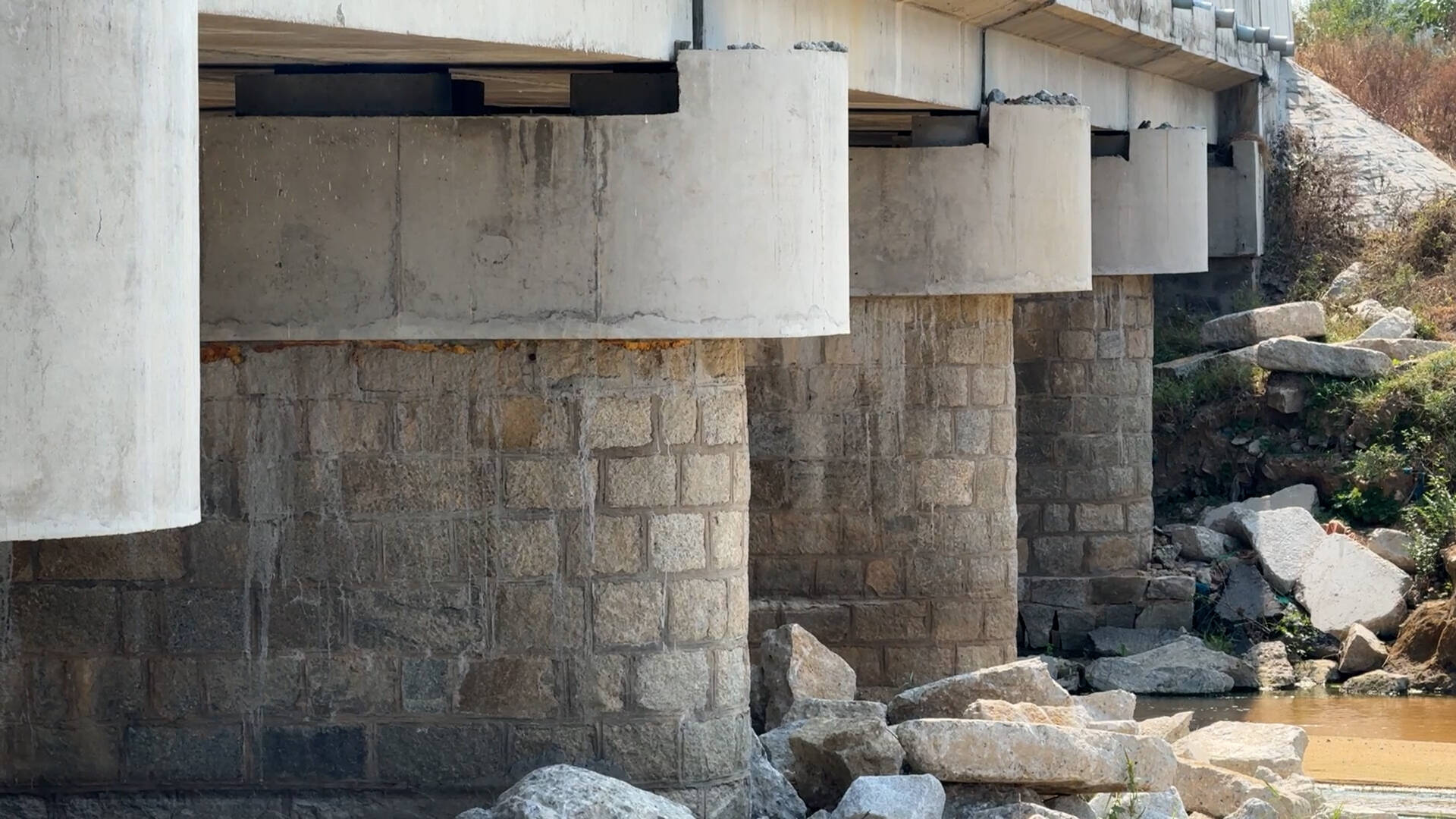 大桥不修,周边村民通行不便。《生活帮》记者来到桥下看到,桥墩处有明显损坏,桥台与桥墩之间的水泥结构也已经损毁,水泥石块铺满了河床。