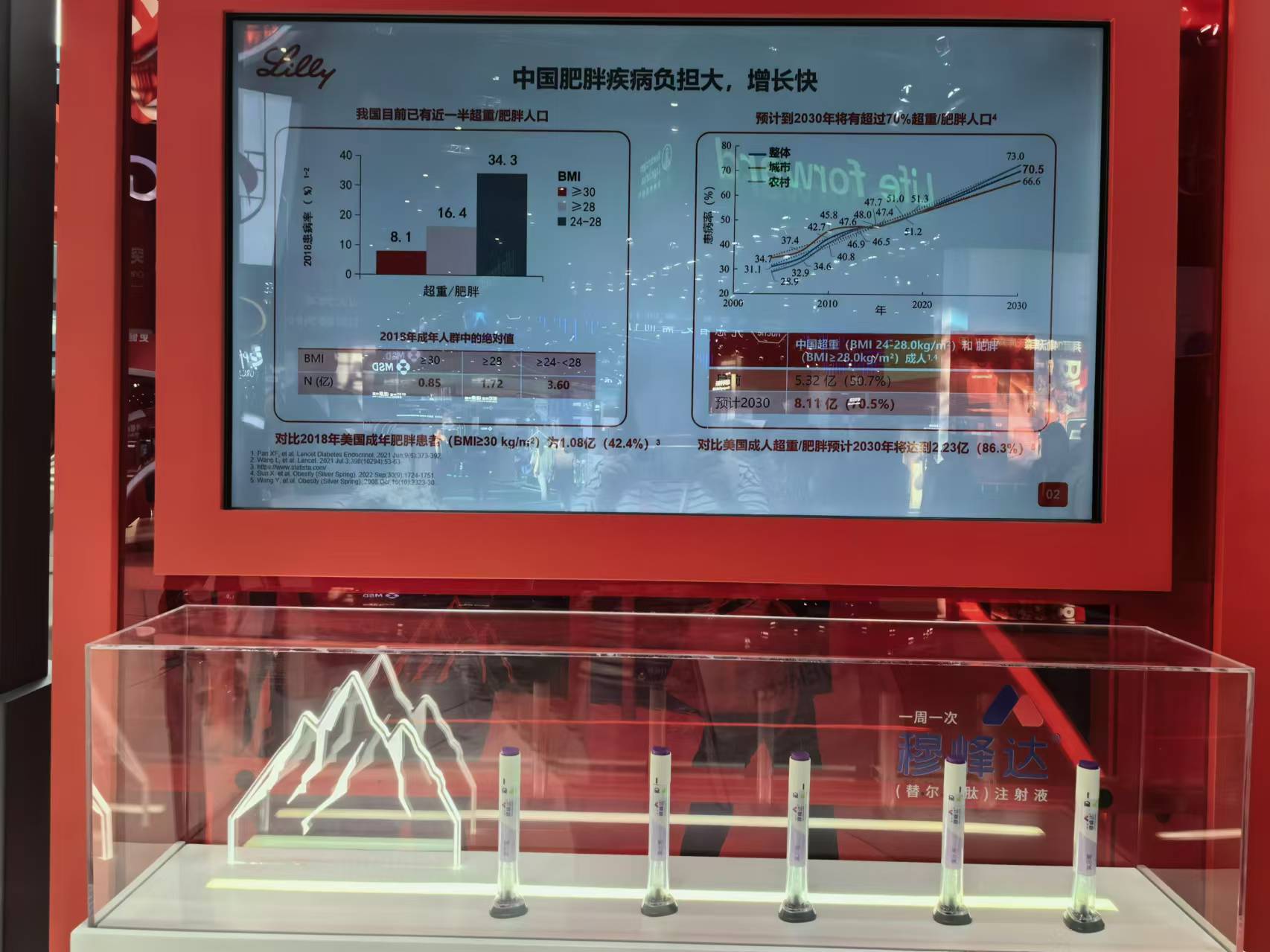 今年9月,礼来曾在2024年中国国际服务贸易交易会上展示替尔泊肽。在这次进博会展台,礼来展示了五支替尔泊肽的演示笔,上方显示屏则通过图文形式介绍了中国肥胖情况以及礼来在心血管代谢健康领域的研发布局。