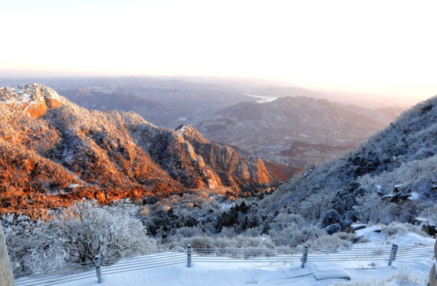冬季的泰山,降雪频繁。大雪过后,整座山被白雪覆盖,从南天门、玉皇顶远望,连绵的山脉犹如一条洁白的玉龙蜿蜒盘旋。无论是古老的庙宇,还是崎岖的山路,都在白雪的装饰下,变得圣洁而美丽。在彩石溪、云步桥等地,往日欢快的溪水在低温作用下凝结成冰,形成洁白无瑕的冰瀑。这些冰瀑形态各异,玲珑剔透,在阳光下变幻出奇妙的光泽,宛如冰雪世界的童话,让人流连忘返。
