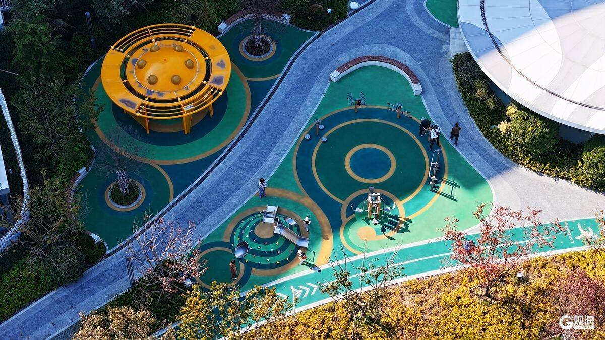 地上结合周边公共绿地,打造了高品质城市公园,绿色的休闲跑道、精致的景观设计、多样的游乐设施、丰富的林木绿化……俯瞰之下,园区颜值高、充满时尚美学。地下则是停车场,宽敞明亮,近百个停车位可以缓解周边居民停车难题。