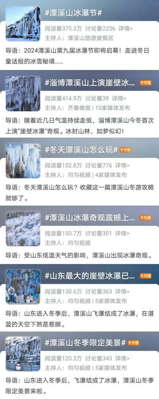 “通过几年的摸索,我们对网络文旅时代的营销传播有了一定的认知和经验。在优质文旅产品的基础上,官方认证推荐、自媒体推荐、自来水(网友)推荐并重。”崔新程说。前段时间,潭溪山与山东省文旅厅、淄博市文旅局等政务帐号,济南电视台天下泉城等媒体帐号;均匀视频、七彩淄博等自媒体账号合作联动,在30天时间内通过微博平台打造“别错过潭溪山冰雪盛宴”等9大热搜话题,累计阅读量高达1300万次,引爆互联网话题热度。