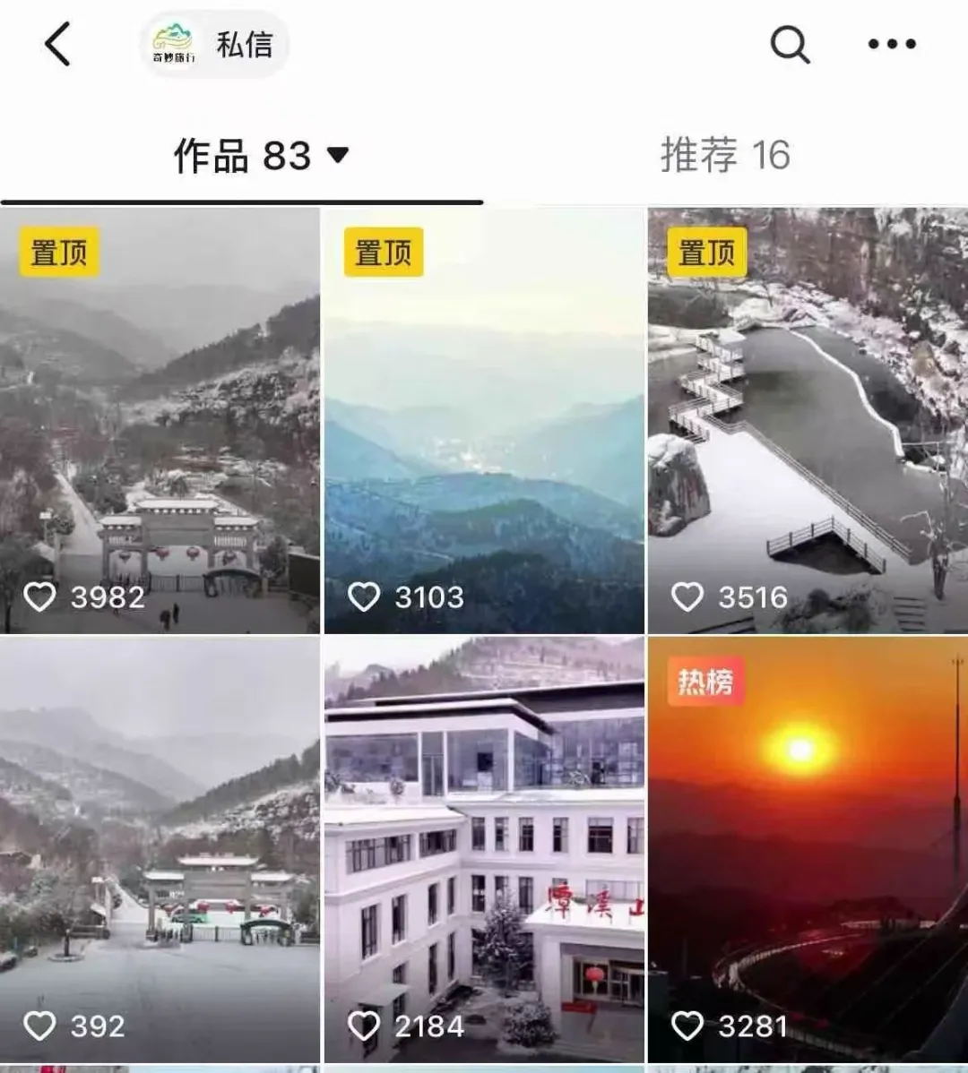 早在2021年左右,潭溪山开始了网络短视频平台的布局。历经四年的发展和总结,如今的潭溪山打出了直播、短视频、社交平台等组合拳,并获得众多关注和效益。以抖音为例,今冬潭溪山精准捕捉核心客源受众,遴选优质冬季素材作为预热内容,发布20余篇短视频,播放量突破40万+次,助推潭溪山冰瀑节成为冬游爆款。