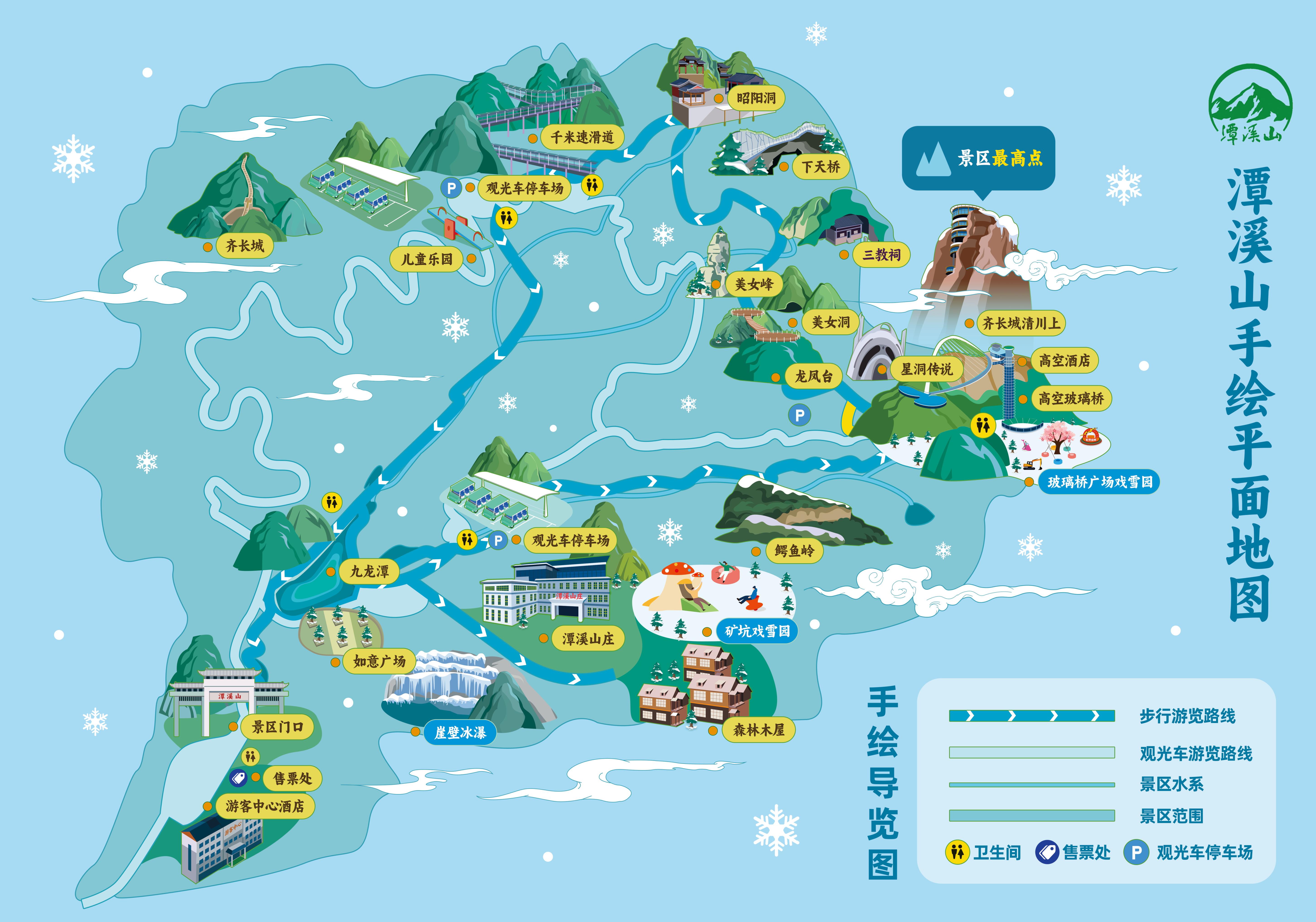 潭溪山冰瀑素有鲁中第一瀑之称。每逢冬季,潭溪山9平方公里山野将化身冰雪世界,高山雪景、森林雾凇随处可见,高空玻璃桥、齐长城清川上洞穴崖壁酒店、森林木屋、高空酒店、潭溪山庄或隐藏于山间或“悬挂”于崖壁,休闲野趣感十足。