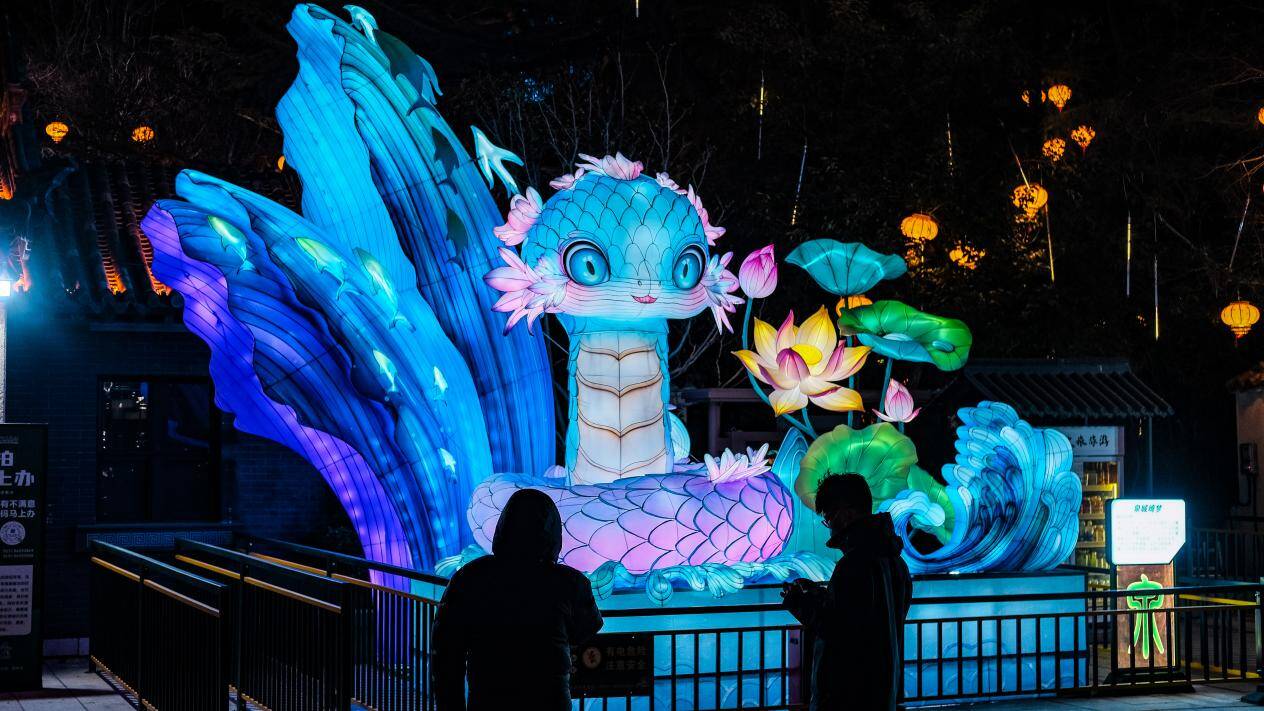 本届灯会将花灯的机械转动和投影技术提质升级,融入现代科技元素,开发出许多令人大开眼界的新“玩法”,比如“湖畔雨荷”灵动眨眼,“灵蛇宝宝”俏皮摆头,《灯火阑珊》的六边形大宫灯360°旋转……以往静态的花灯,在精密机械装置的驱动下“活”了起来,让传统形象变得鲜活生动。