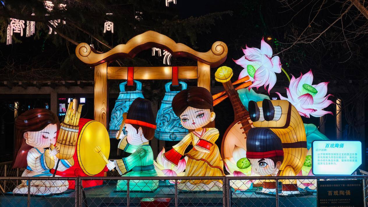 《百戏陶俑》灯组,以济南博物馆镇馆之宝——西汉彩绘乐舞杂技陶俑为原型,对人物进行创新设计,展现乐舞杂技形象,再现了当时风行市井的“百戏”在演出时的热闹场景。陶俑击鼓的动作让花灯更具动感,卡通形象让这一古老的文化瑰宝以全新面貌示人,让文物“活起来”。