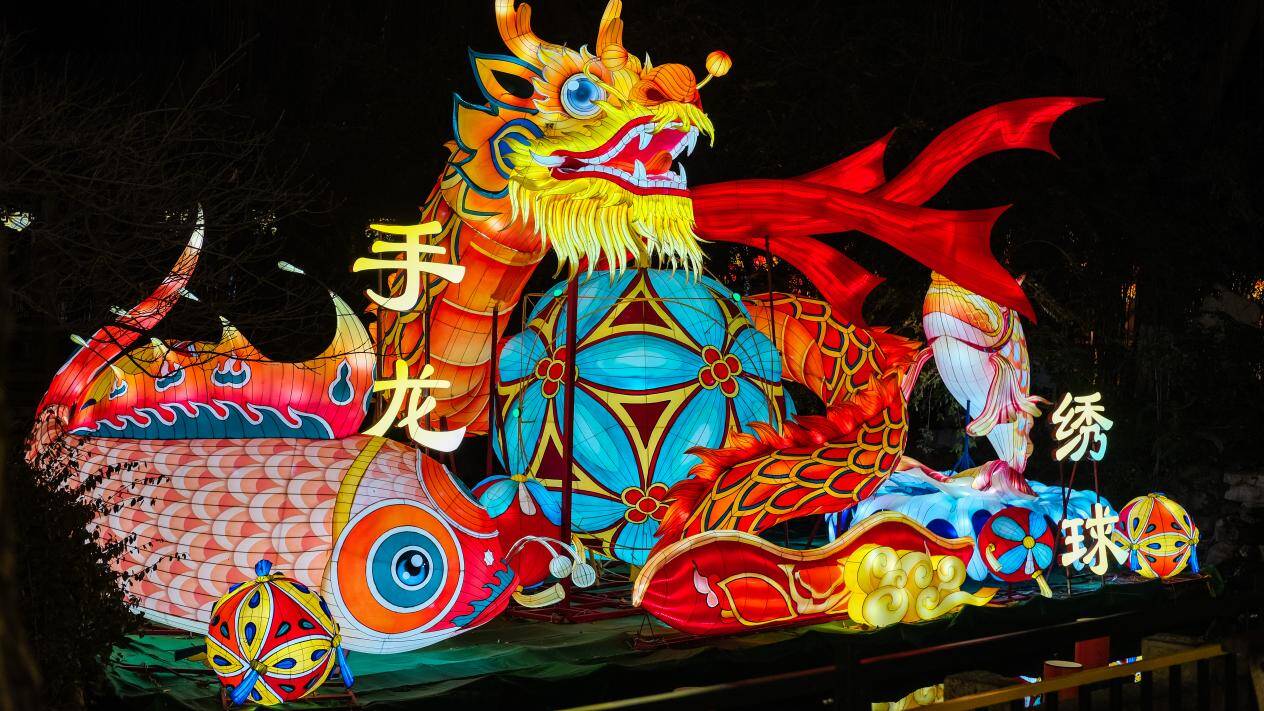 在提升科技感的同时,济南文旅集团在本届灯会的打造过程中,还格外注重文化内涵的深度挖掘与精准呈现。位于井影泉水面的《手龙绣球》灯组,巨龙嘴巴开合之间,霸气风范尽显。手龙绣球灯起源于山东,是以手龙和绣球灯为道具,以武术和民艺相结合的一种舞蹈艺术形式。花灯不但利用水面将龙、绣球与锦鲤等吉祥物融合一体,展示出生命、活力与希望,也彰显了齐鲁大地的文化魅力。