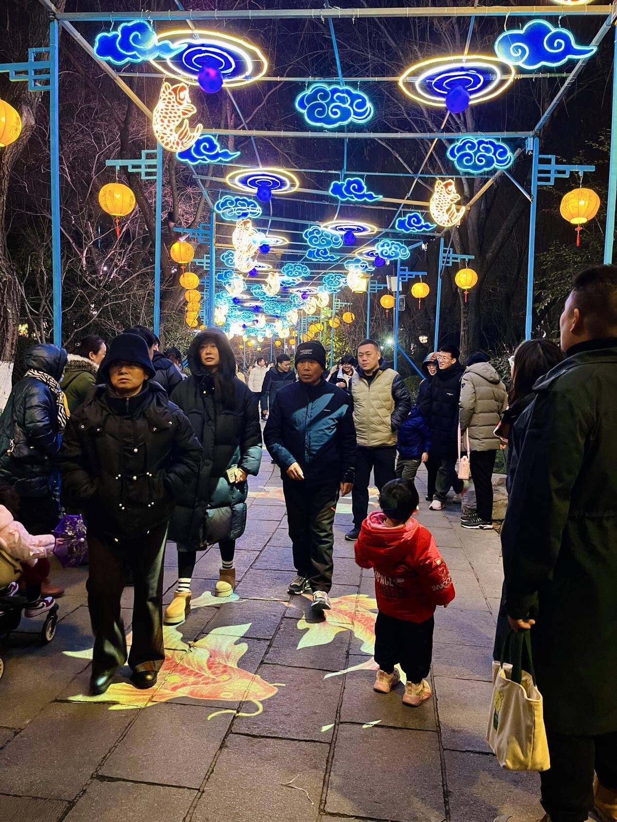 在趵突泉景区悠然轩东侧小路,《观鱼游》灯组扮靓道路两侧。游客漫步于廊道中,抬头可见红色锦鲤与蓝色祥云相映成趣,低头可见光影投射出的锦鲤在脚下游动,许多小朋友用脚踩在锦鲤图案上,沾沾好运气。