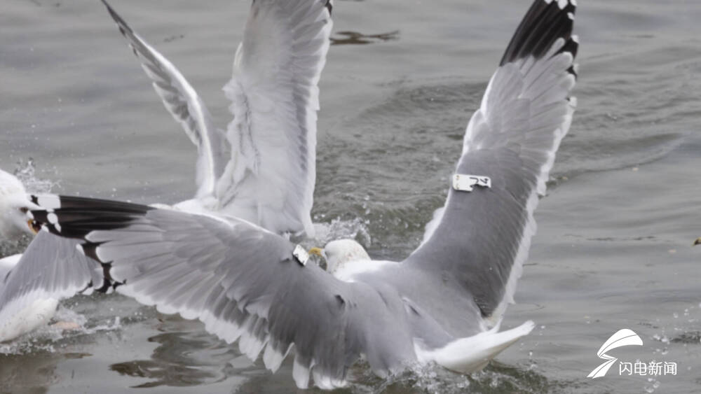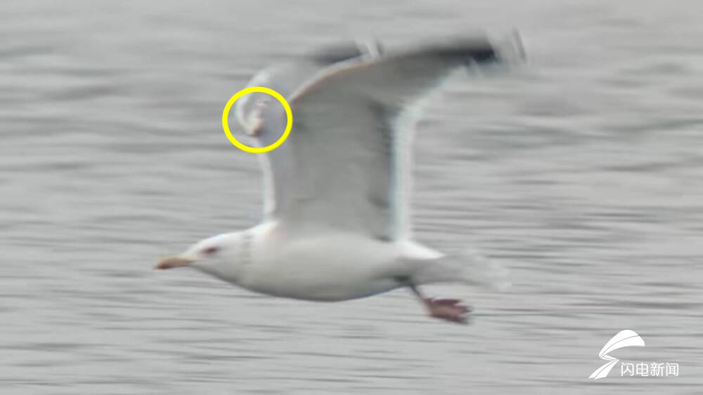 青岛市民郑先生告诉记者,周六早上七点半左右,他在青岛李村河下游、靠近入海口的地方,发现这只海鸥正准备起飞,“我就抓拍了一个视频,发现两边翼标都有破损的痕迹。”