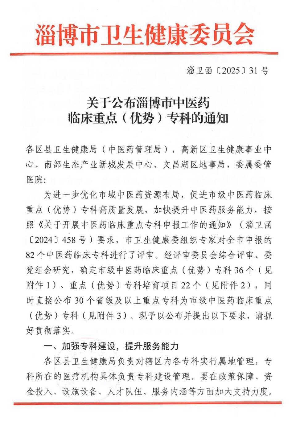 近日,淄博市卫生健康委发布《关于公布淄博市中医药临床重点(优势)专科的通知》,经过严格评审,淄博市妇幼保健院中医科获评淄博市中医药临床重点专科,标志着医院中医学科发展取得显著成果。