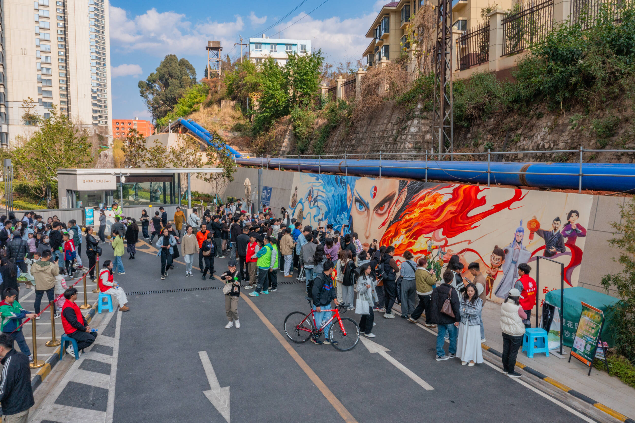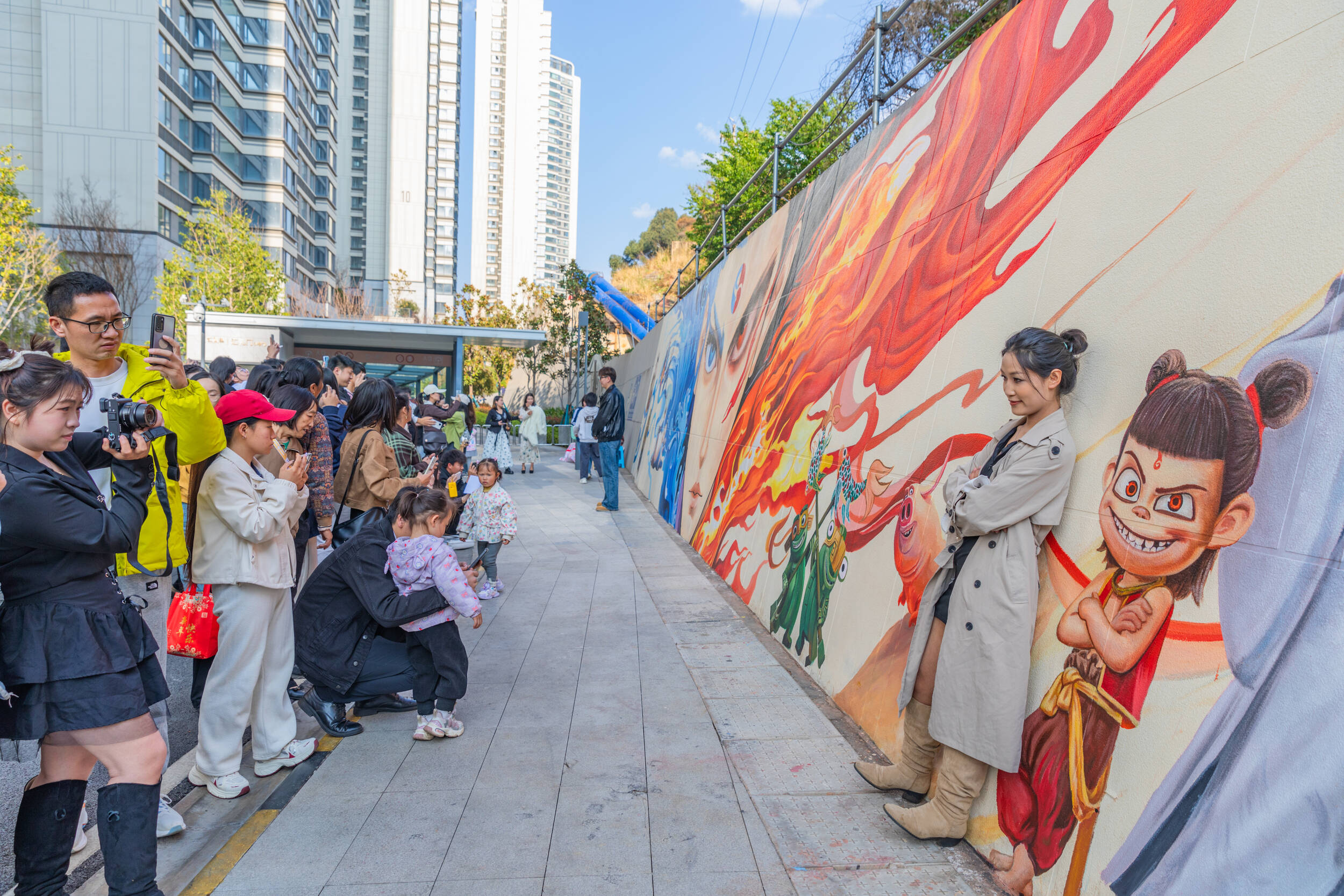 云南昆明,盘龙区西林社区一幅以《哪吒之魔童闹海》(简称《哪吒2》)为主题的墙绘亮相,引发市民关注,吸引了大量游客前来拍照打卡。
