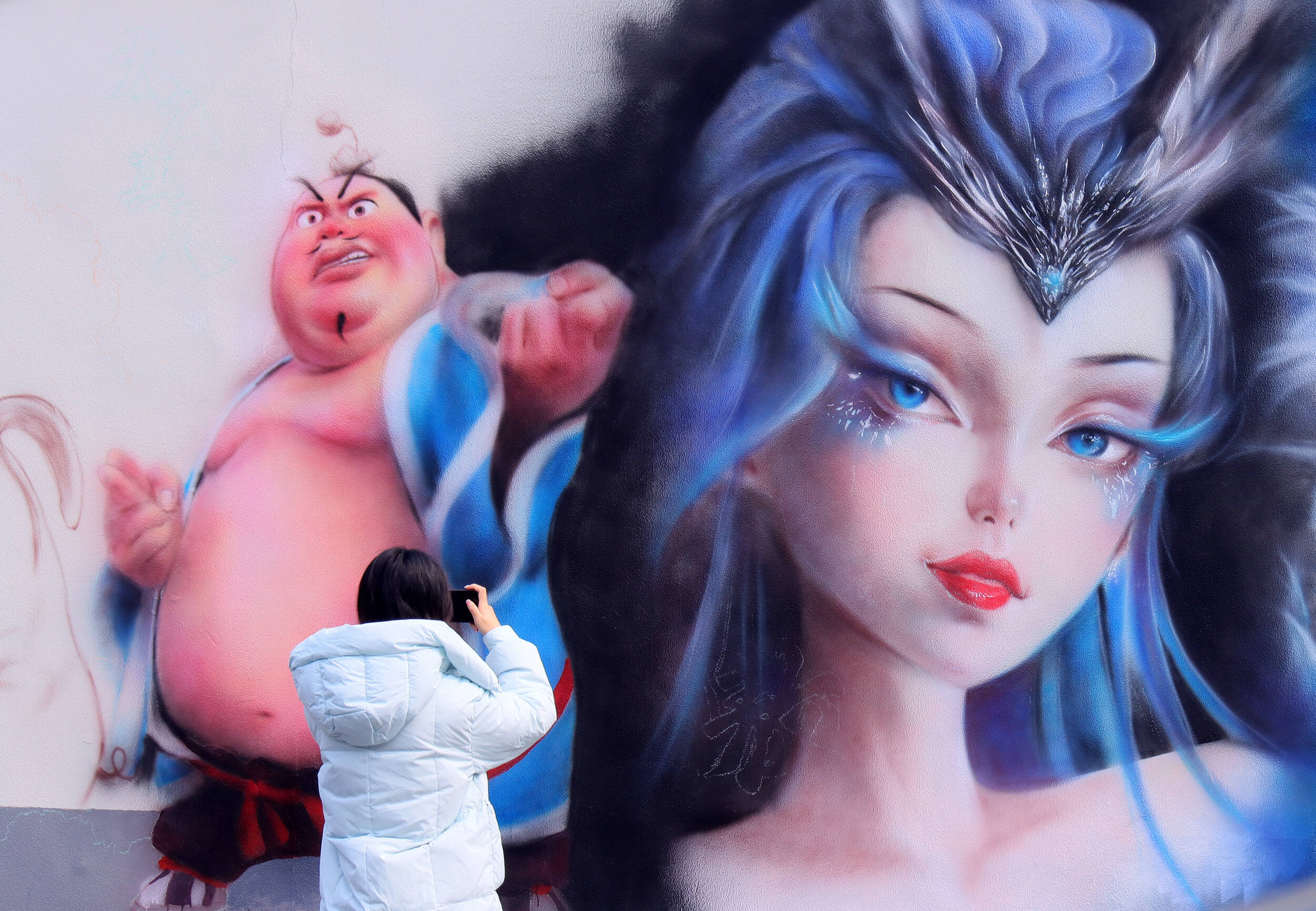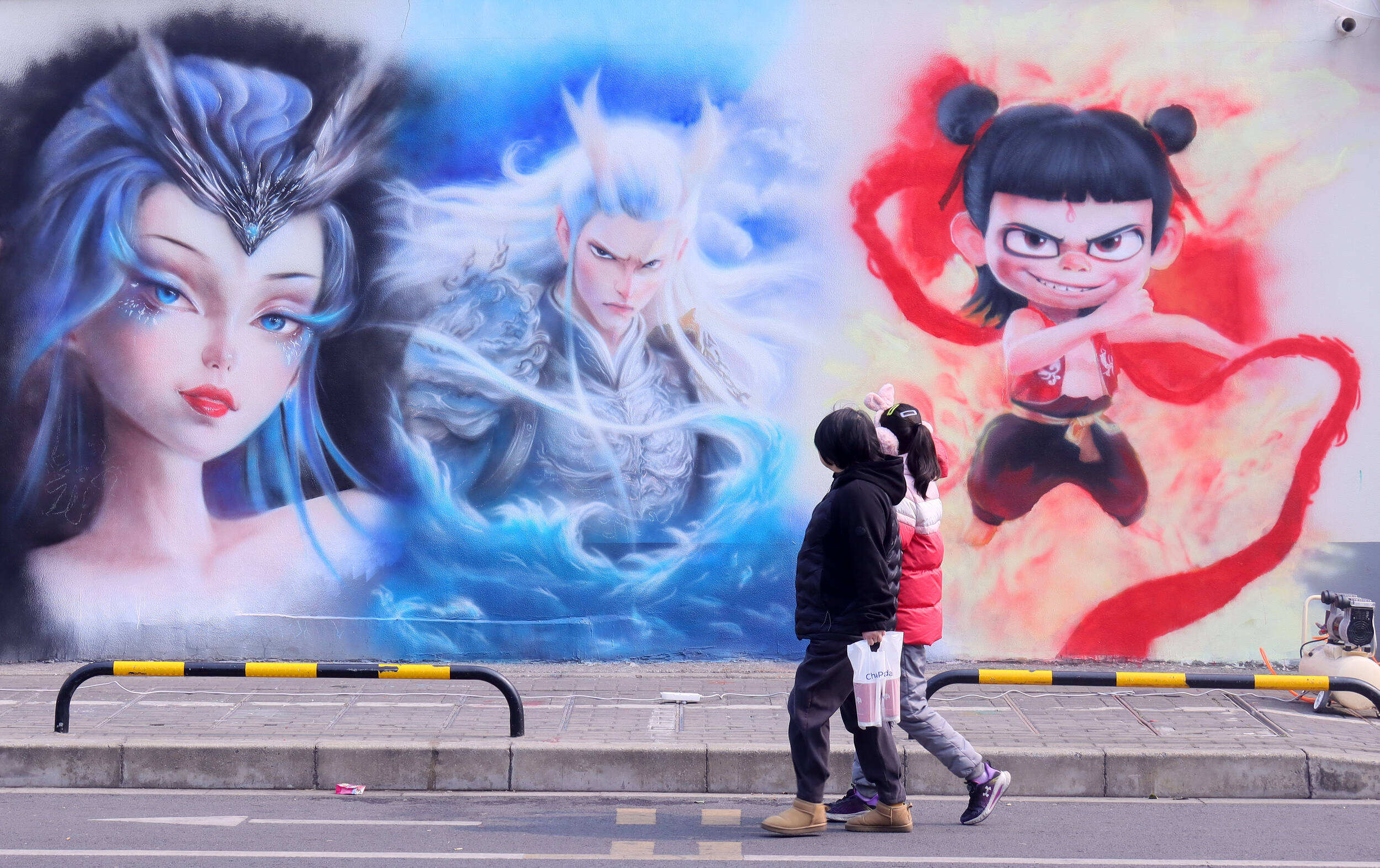 江苏常州,市民在“哪吒天团”墙绘前拍照打卡。
