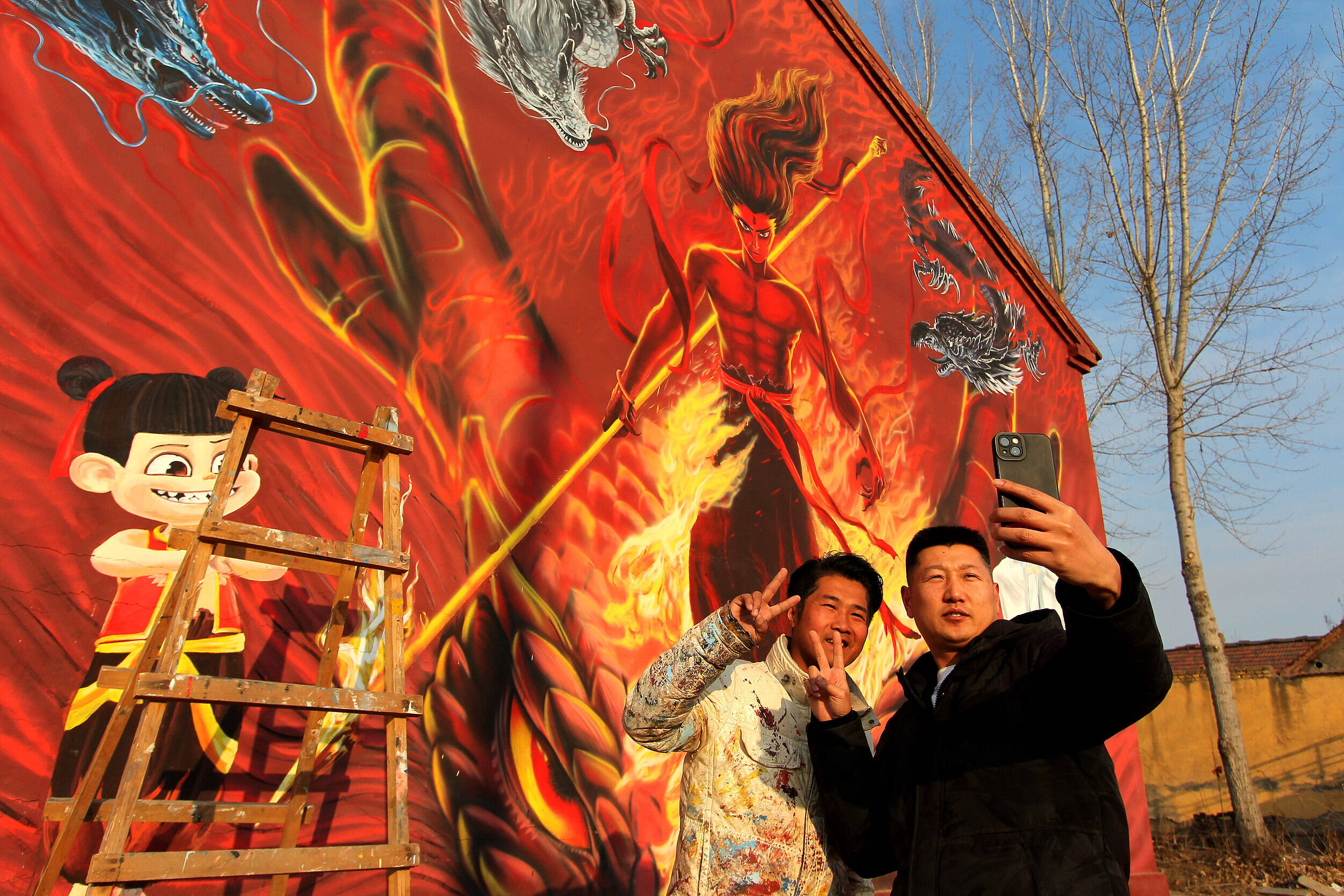 山东淄博周村区沈家村,人们在哪吒墙画前合影