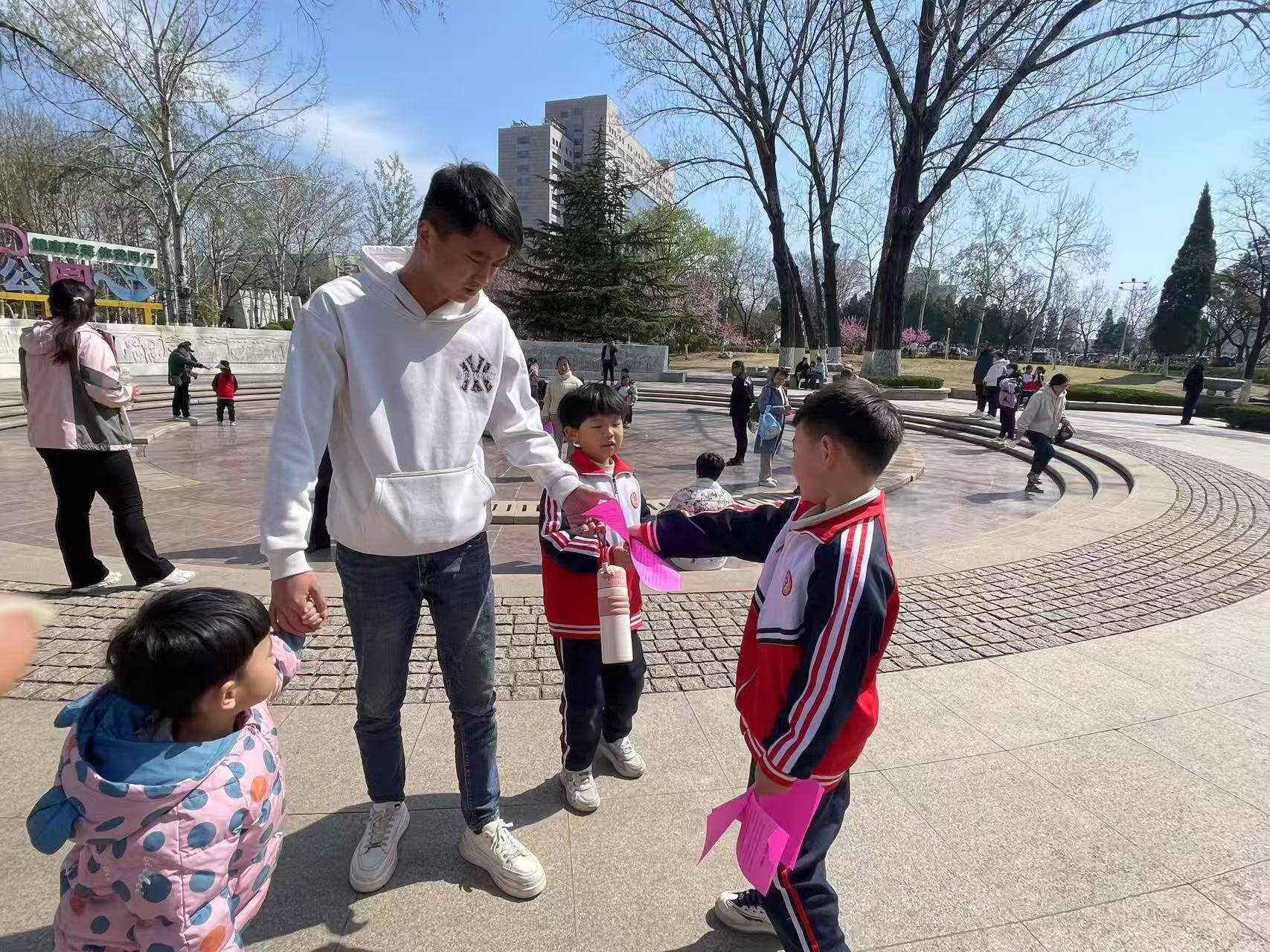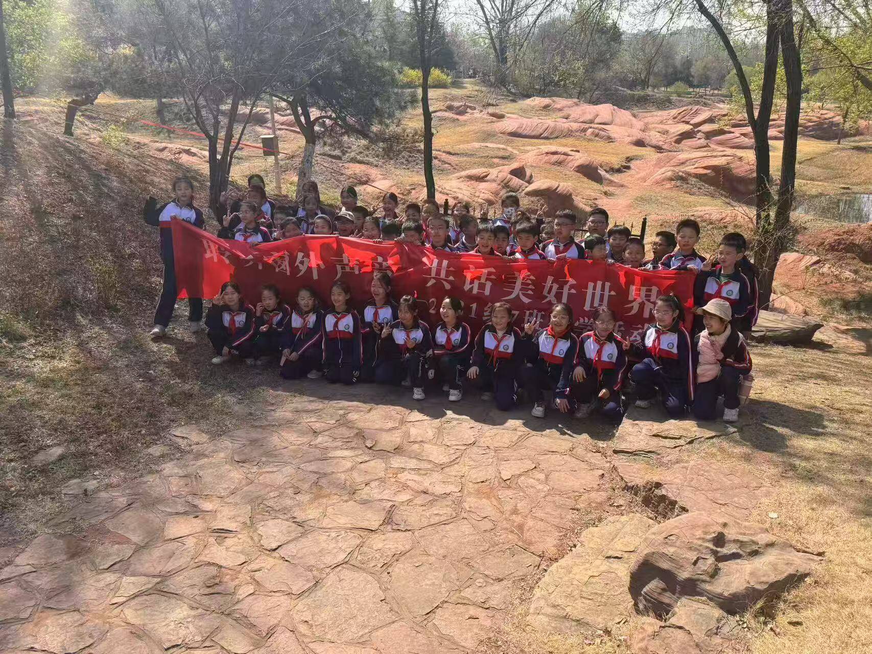 同学们在工作人员的带领下,沿着蜿蜒的健康步道开启研学之旅。漫步在春意盎然的公园里,同学们一边欣赏沿途春色,一边聆听"红石地质"景观的独特魅力。在轻松愉快的氛围中,不仅学到了地质知识,更感受到了大自然的鬼斧神工。东门小广场上,"桃花朵朵开""夹纸游戏""过河搭桥"等趣味游戏让同学们在欢声笑语中体验团队协作的快乐。