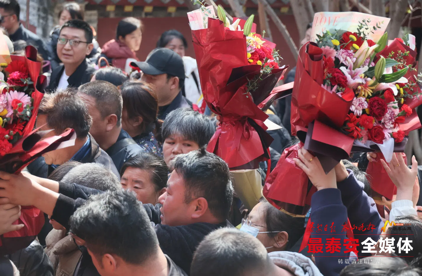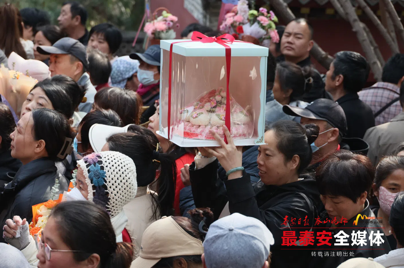 3月31日一早,泰山脚下的王母池山门外便排起了长队,来自四面八方的祈福游客手中拿着蛋糕或鲜花,在工作人员和志愿者的指引下,有序排队进入王母池祈福。“我每年农历三月三都会来泰山王母池祈福,已经坚持了四十多年。这几年最大的感受就是秩序越来越好了,虽然人多,但工作人员引导得很到位。”来自临沂的祈福游客刘先生说。
