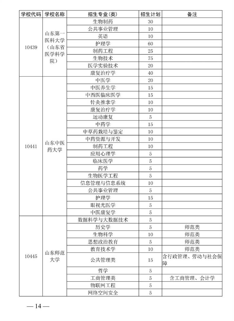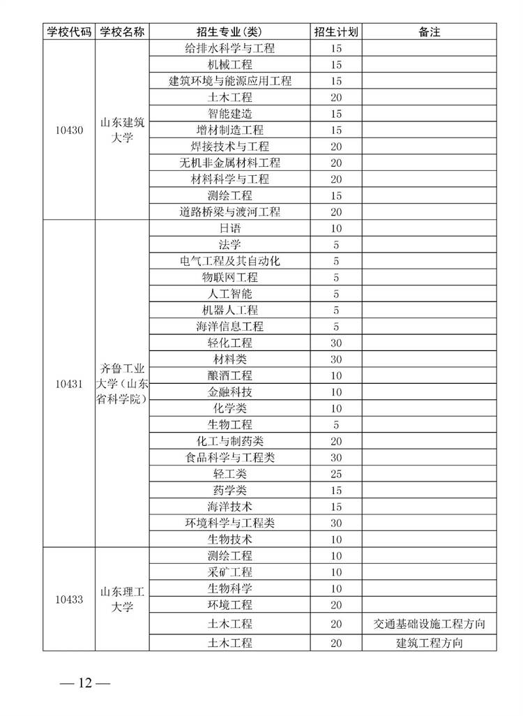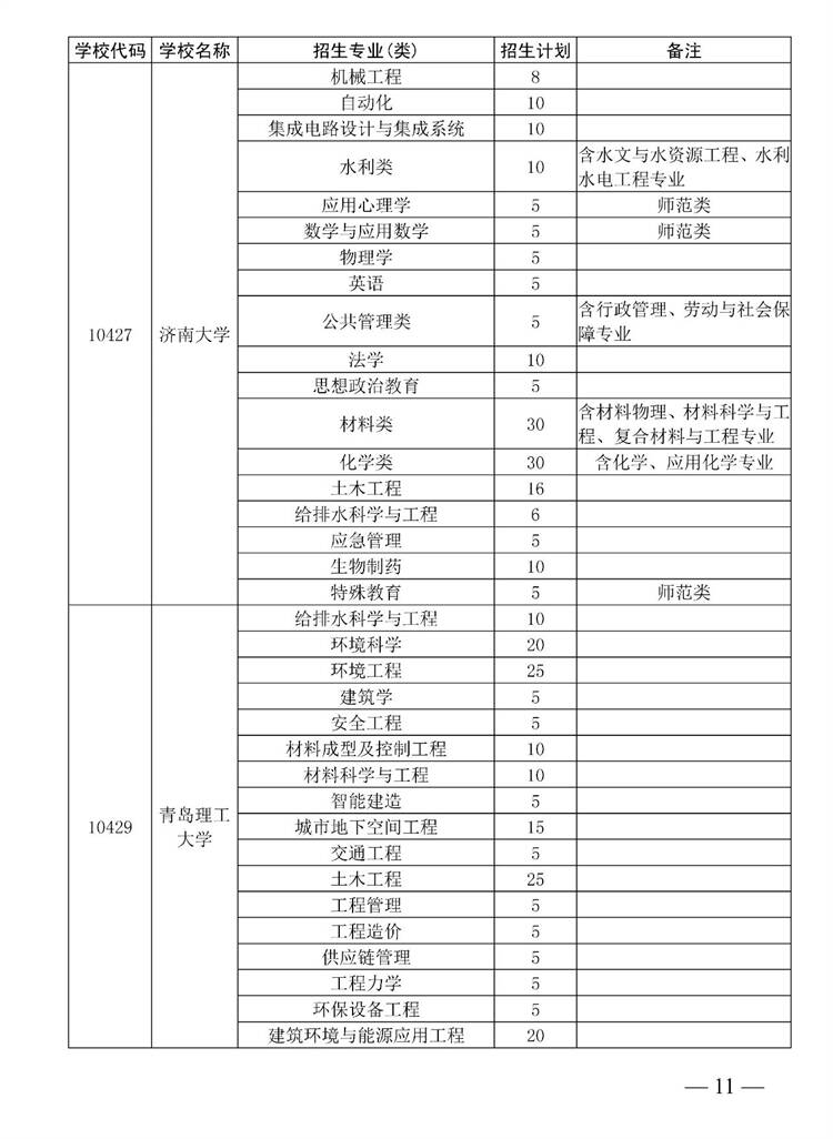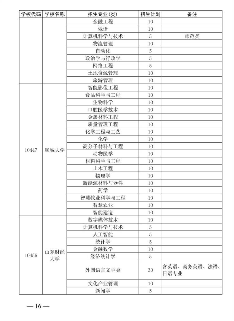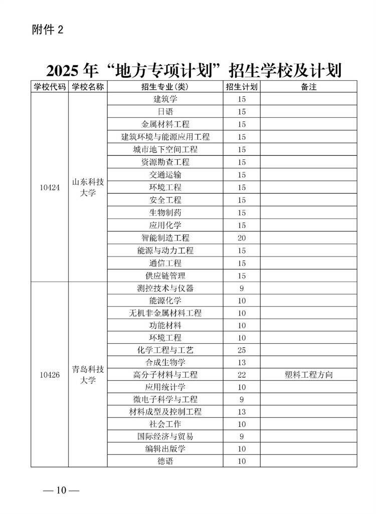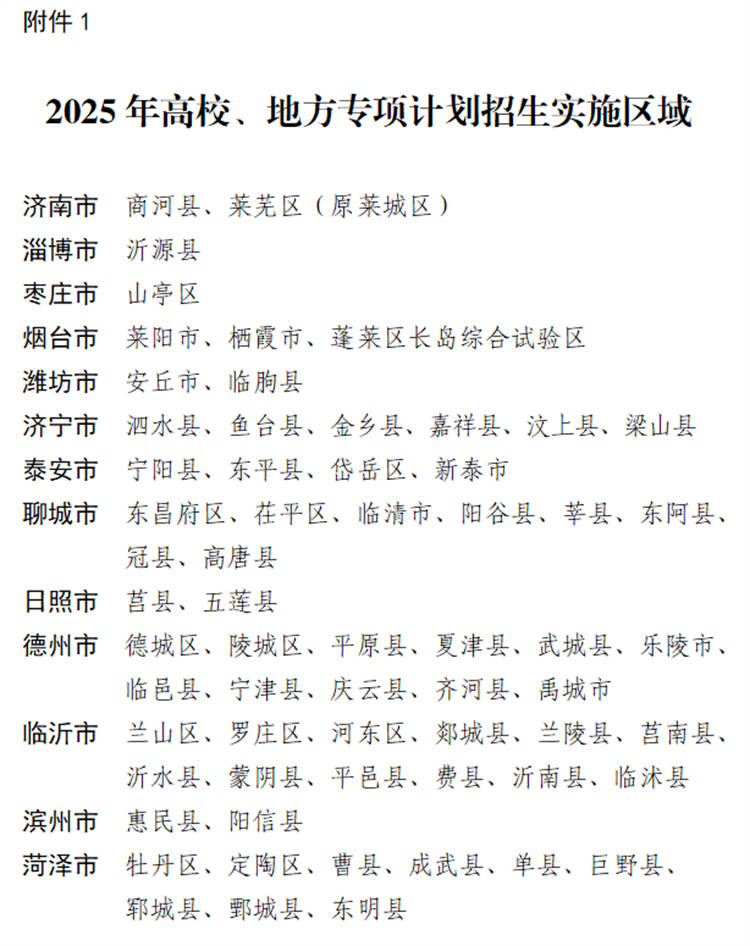 高校专项计划由教育部确定。地方专项计划为山东科技大学、青岛科技大学、济南大学、青岛理工大学、山东建筑大学、齐鲁工业大学(山东省科学院)、山东理工大学、山东农业大学、青岛农业大学、山东第一医科大学(山东省医学科学院)、山东中医药大学、山东师范大学、曲阜师范大学、聊城大学、山东财经大学、青岛大学等16所高校。
