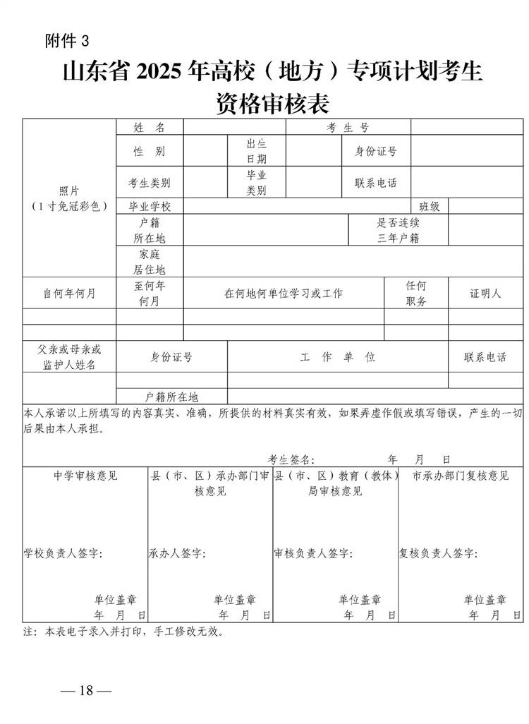 高校专项计划报名考生须填写《山东省2025年高校(地方)专项计划考生资格审核表》(附件3,以下简称《审核表》),考生本人在《审核表》规定区域签字确认后,连同本人及父亲或母亲户口簿、本人身份证原件及复印件交学籍所在中学进行初审(如申请人提供其他法定监护人户口簿的,须同时提供法定监护人资格证明)。学校初审确认考生提交的材料信息无误后,由学校负责人在《审核表》上签字并加盖学校公章,连同相关支撑材料一并报县(市、区)教育(教体)局资格审核承办部门审核,同时在学生本人所在中学公示3个工作日。县(市、区)教育(教体)局对学校上报的《审核表》及相关支撑材料进行审核,合格考生名单在教育行政部门或招考机构网站公示3个工作日。