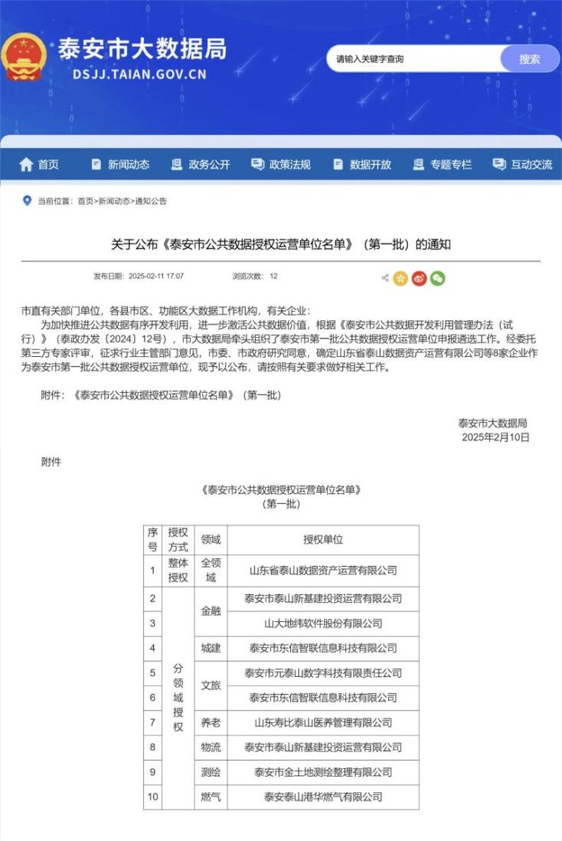 近年来,泰安市以公共数据开发利用为牵引,全面推进数据要素市场化配置改革。在全省率先出台《泰安市公共数据开发利用管理办法(试行)》(泰政办发〔2024〕12号),明确公共数据登记确权、授权运营、安全监管等实施路径。市大数据局组织完成全市82个部门单位的144个数据集登记确权,开展了全市公共数据授权运营单位的申报遴选工作,经委托第三方专家评审,征求行业主管部门意见,市委、市政府研究同意,确定山东省泰山数据资产运营有限公司等8家企业作为首批公共数据授权运营单位。运营单位需按照“一场景一申请”的要求,提交数据需求,经市大数据局和数据提供单位审核后,本着“原始数据不出域,数据可用不可见”的原则开发数据产品。在保证数据安全的前提下,加快数据产品打造,激活公共数据价值,赋能千行百业。