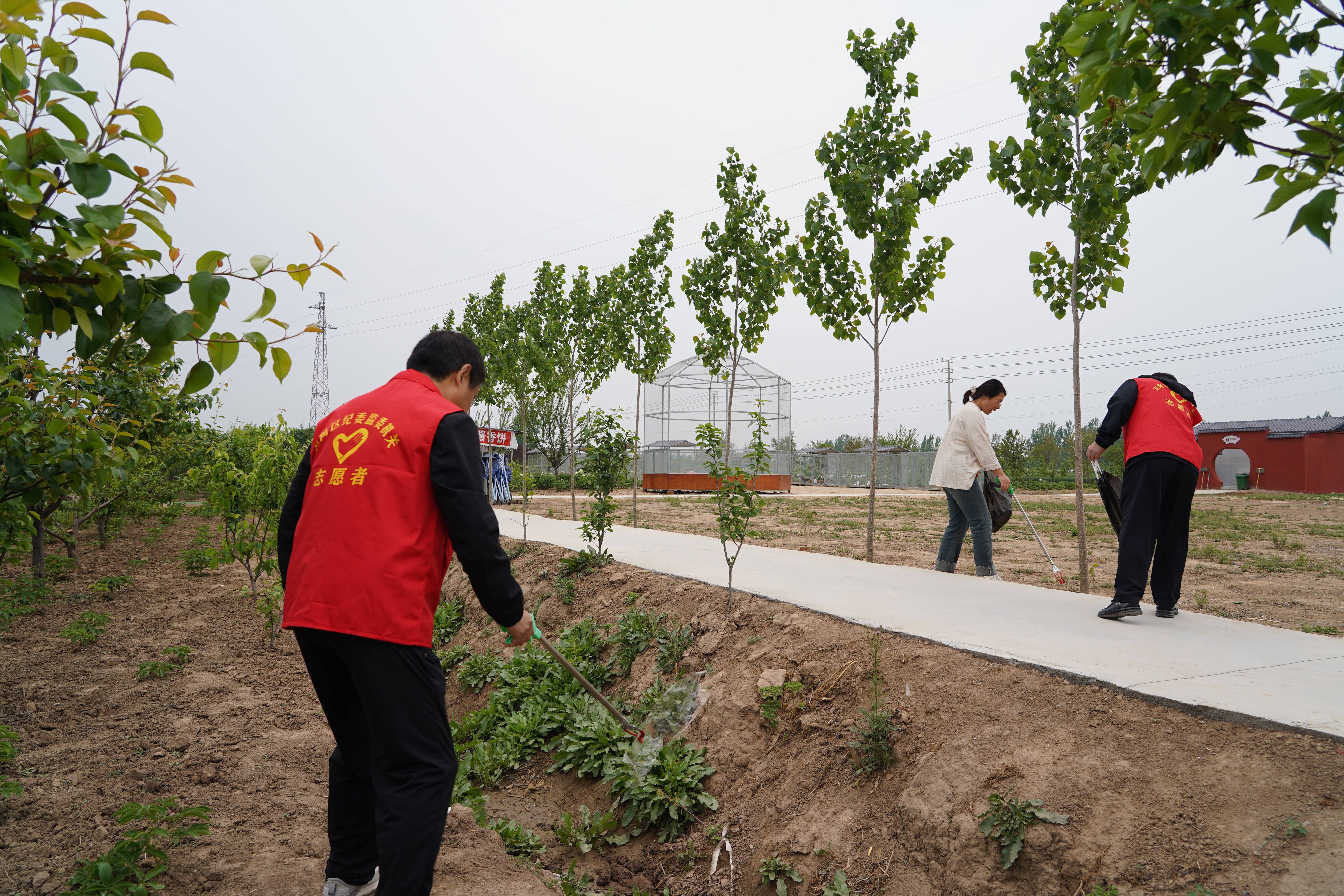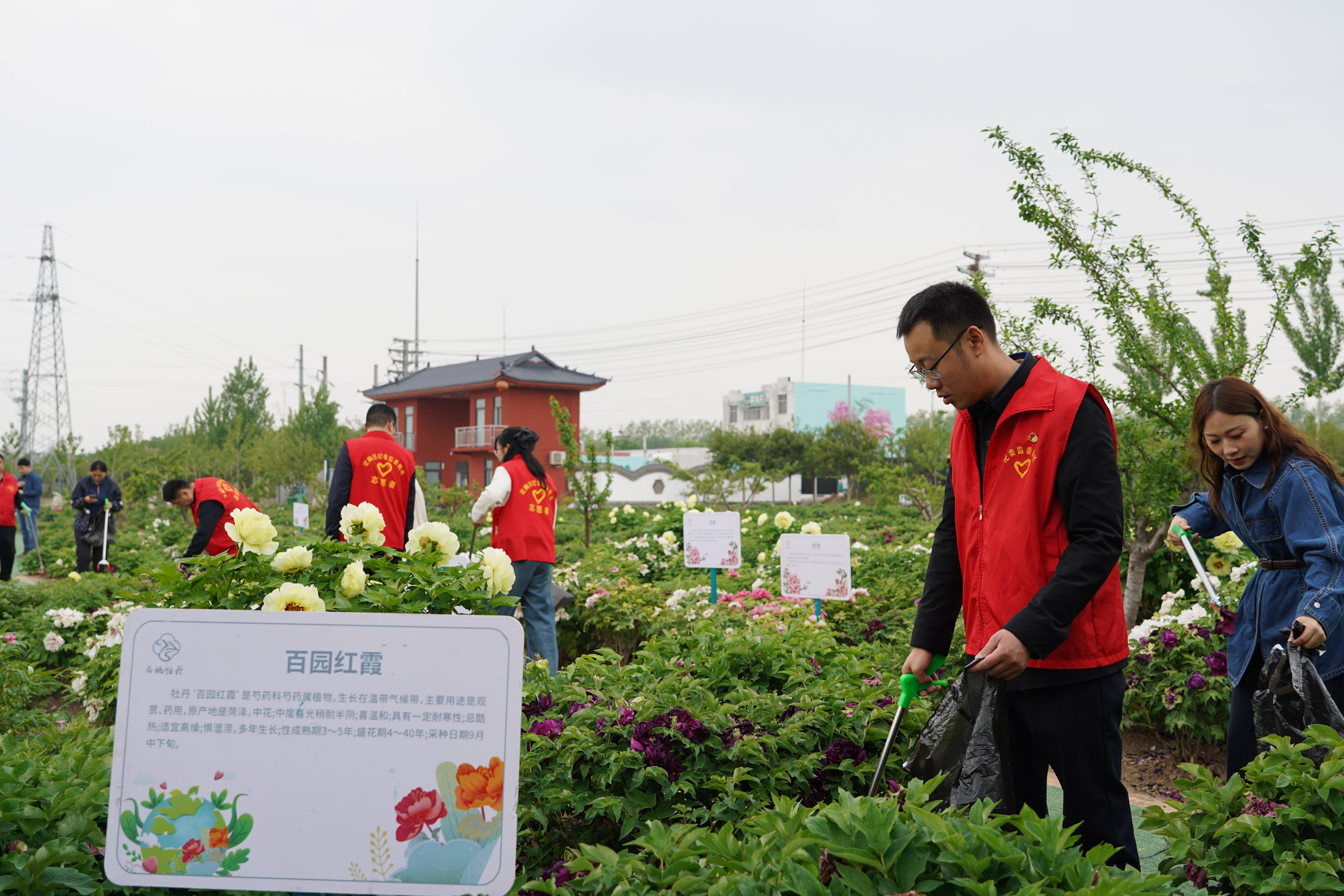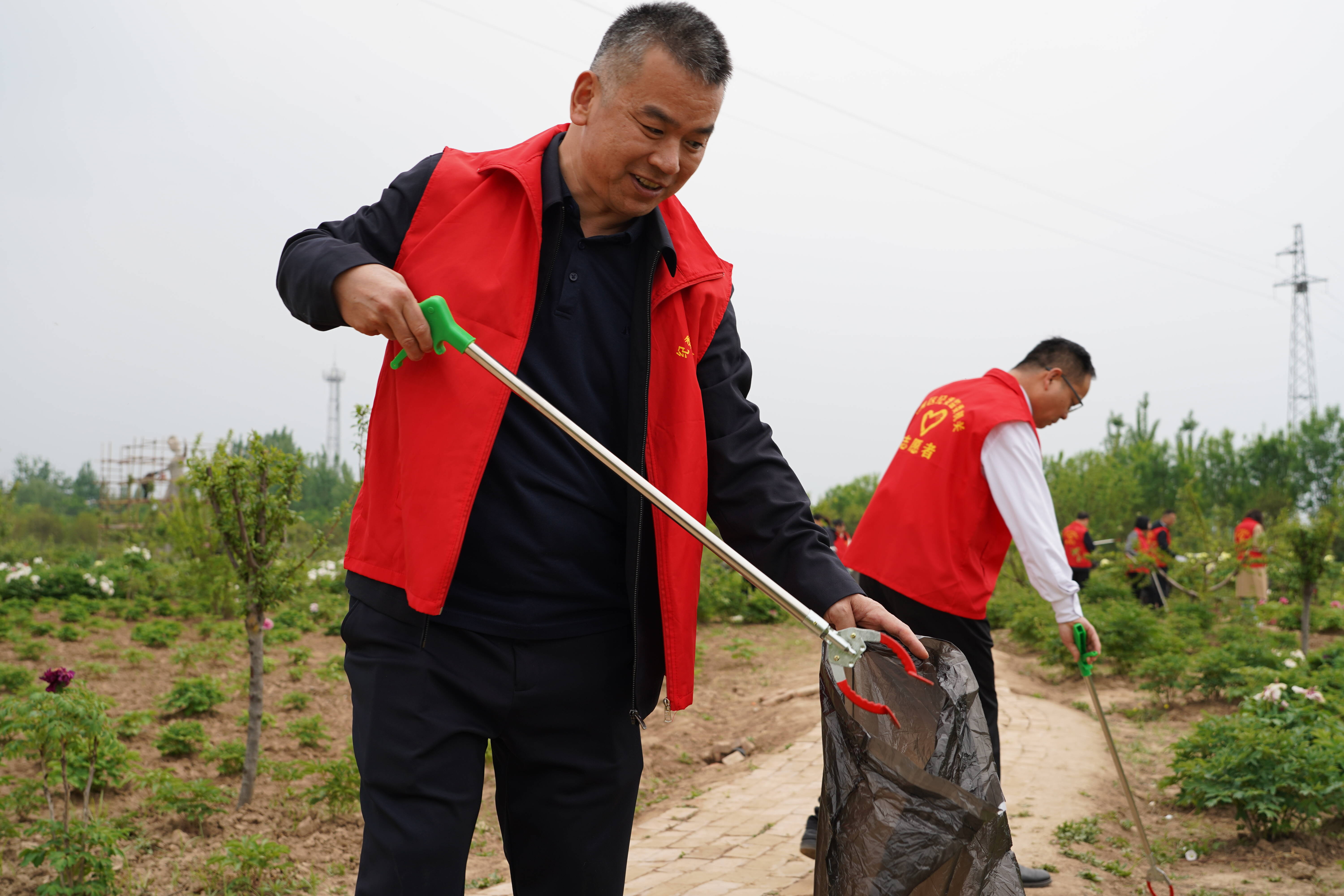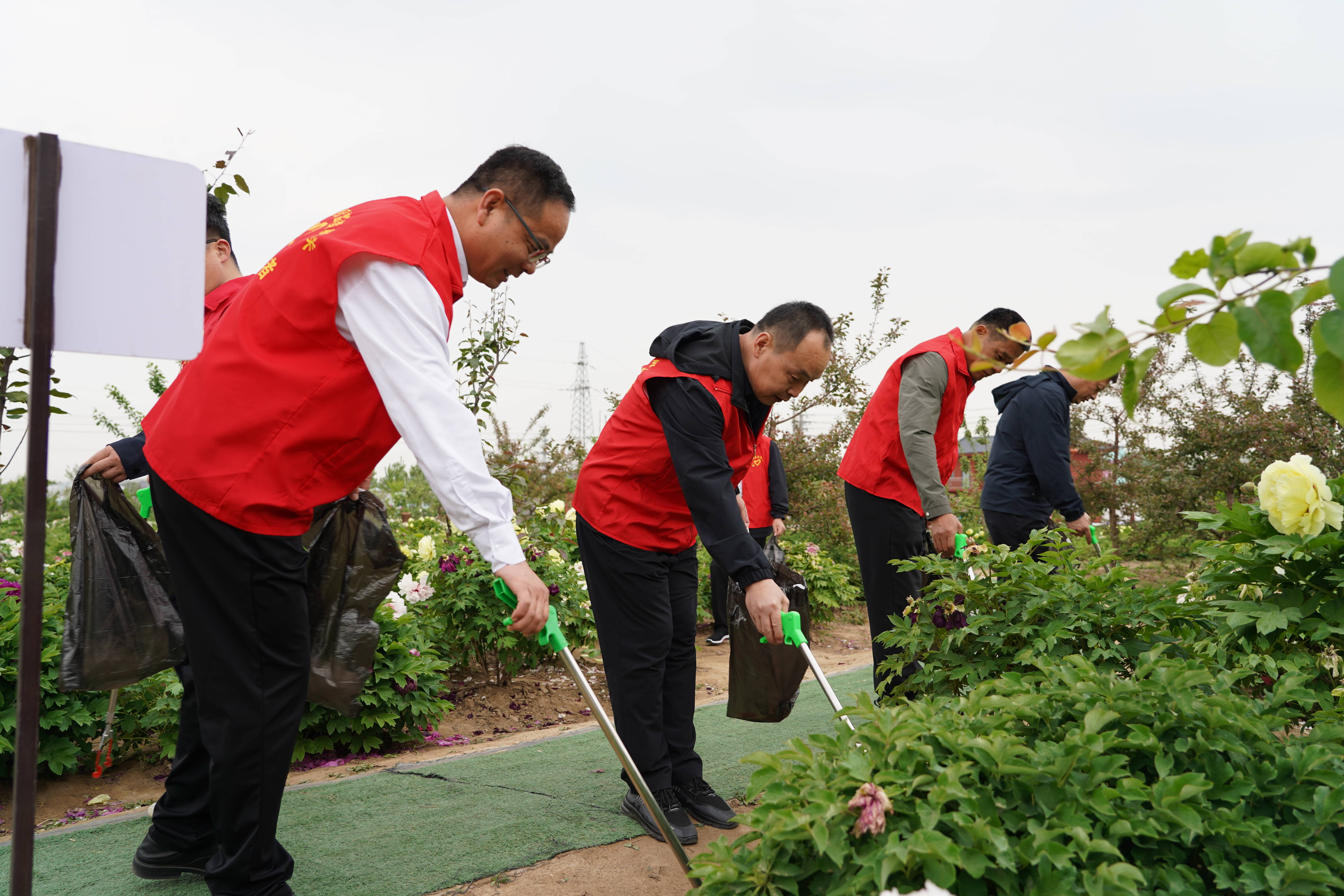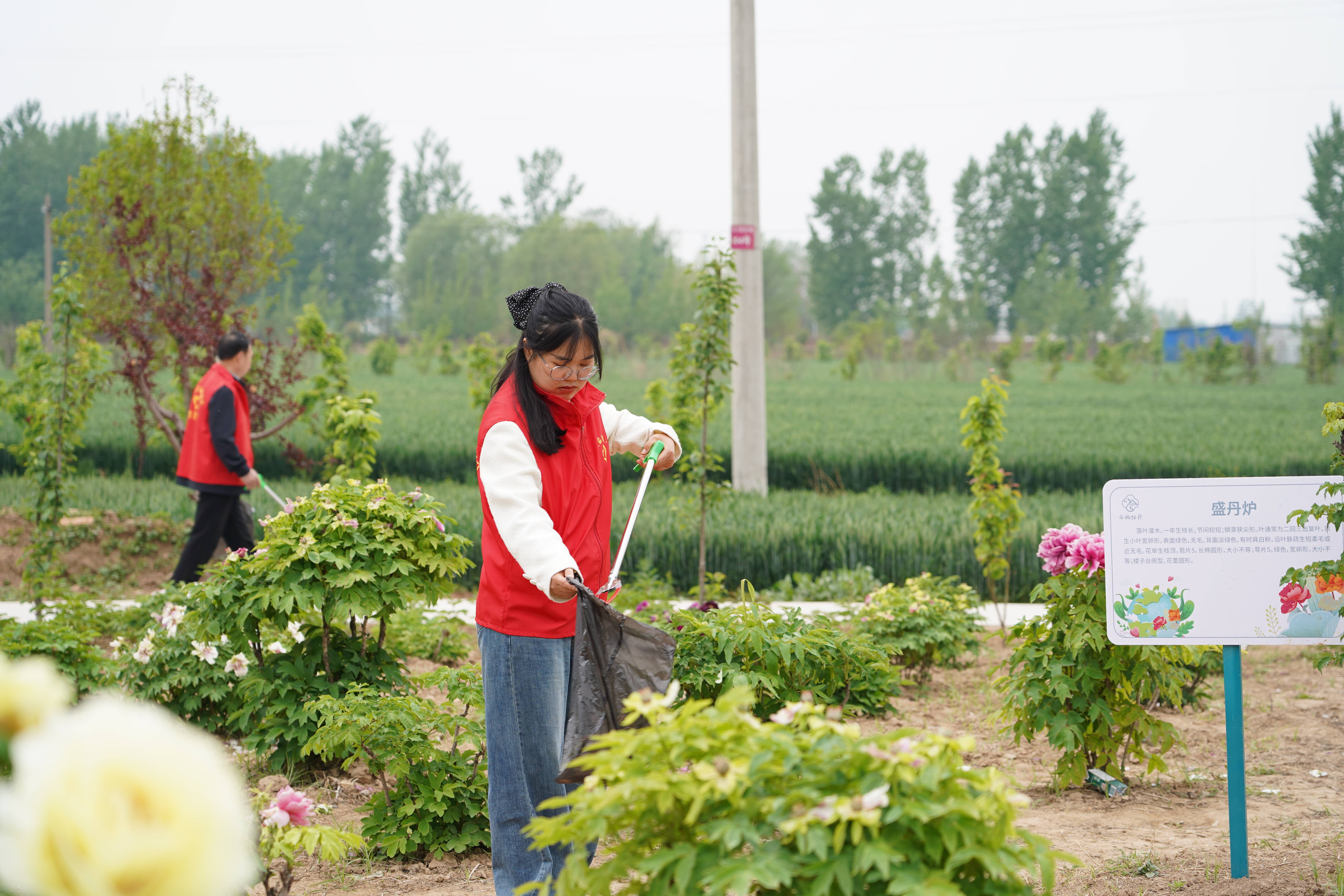 晨光熹微,党员志愿者们已集结完毕。他们身着鲜红马甲,高擎“党员志愿服务队” 旗帜,手持垃圾夹、环保袋等工具,如同一支训练有素的队伍,迅速投身西施牡丹园的环境整治工作。主景区内、停车场上及周边道路旁,都有他们躬身劳作的身影。面对烟头、卫生纸等细碎垃圾,志愿者们不惧脏累,俯身捡拾,细致排查每一处角落,以“绣花功夫” 清理卫生死角,不放过任何一处瑕疵。