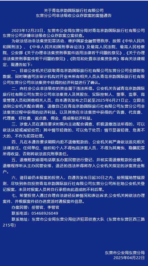 齐鲁网·闪电新闻4月22日讯 2023年12月23日,东营市公安局东营分局对青岛京韵国际旅行社有限公司东营分公司涉嫌非法吸收公众存款案立案侦查。为依法惩治非法集资犯罪活动,维护国家金融管理秩序,按照《中华人民共和国刑法》《中华人民共和国刑事诉讼法》及最高人民法院、最高人民检察院、公安部《关于办理非法集资刑事案件适用法律若干问题的意见》《关于办理非法集资刑事案件若干问题的意见》《防范和处置非法集资条例》等有关法律规定,现通告如下: