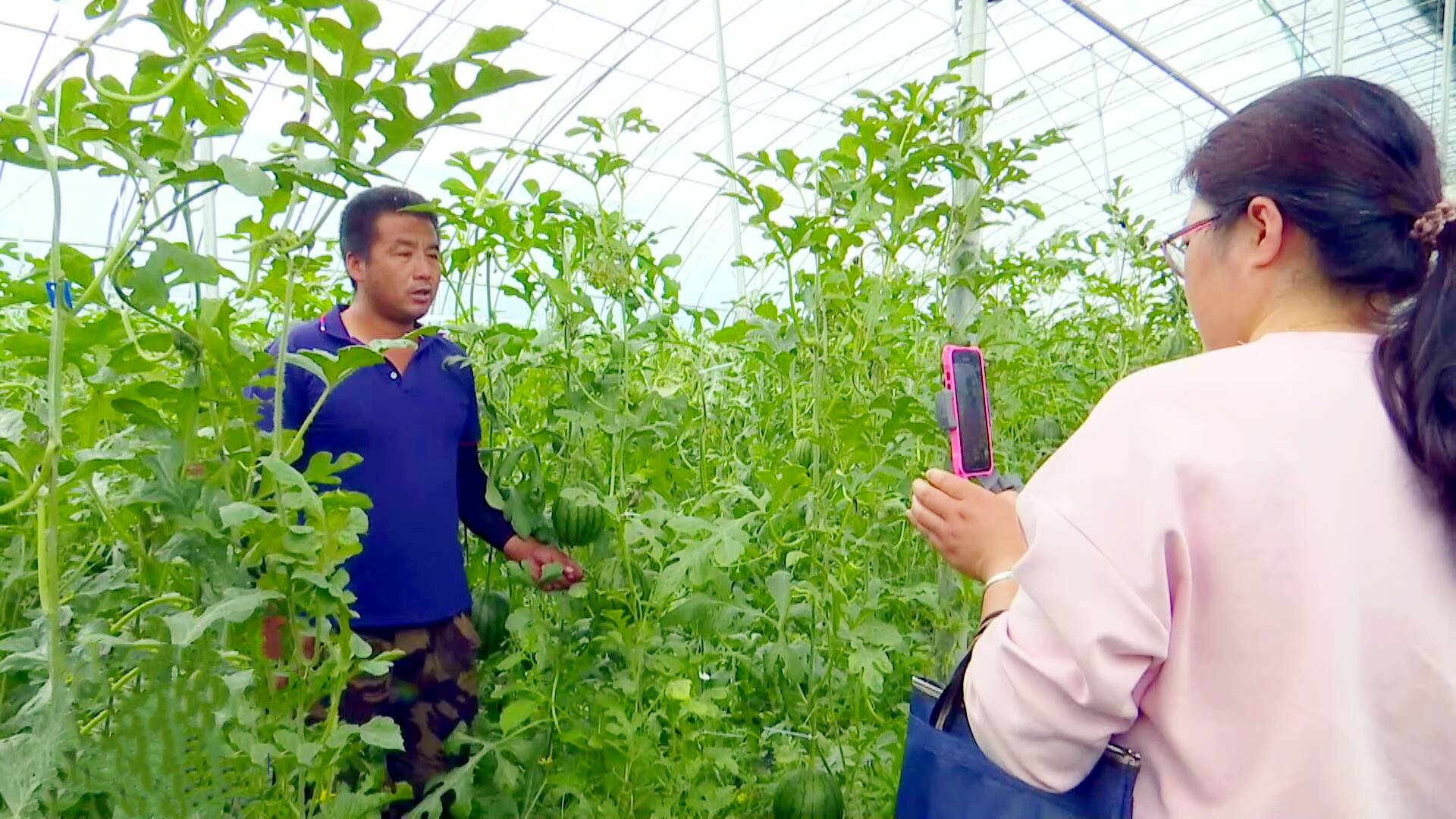 在五龙河现代农业智慧园的西瓜种植大棚里,郁郁葱葱的瓜蔓蜿蜒向上,长势旺盛,瓜藤上挂着一个个2K西瓜,大小均匀、色泽鲜亮,分外诱人。“没想到他们会这么样地来帮助我们农户来卖西瓜,非常希望他们把我们农户的西瓜销售出去。”西瓜种植户孙红玲说道。