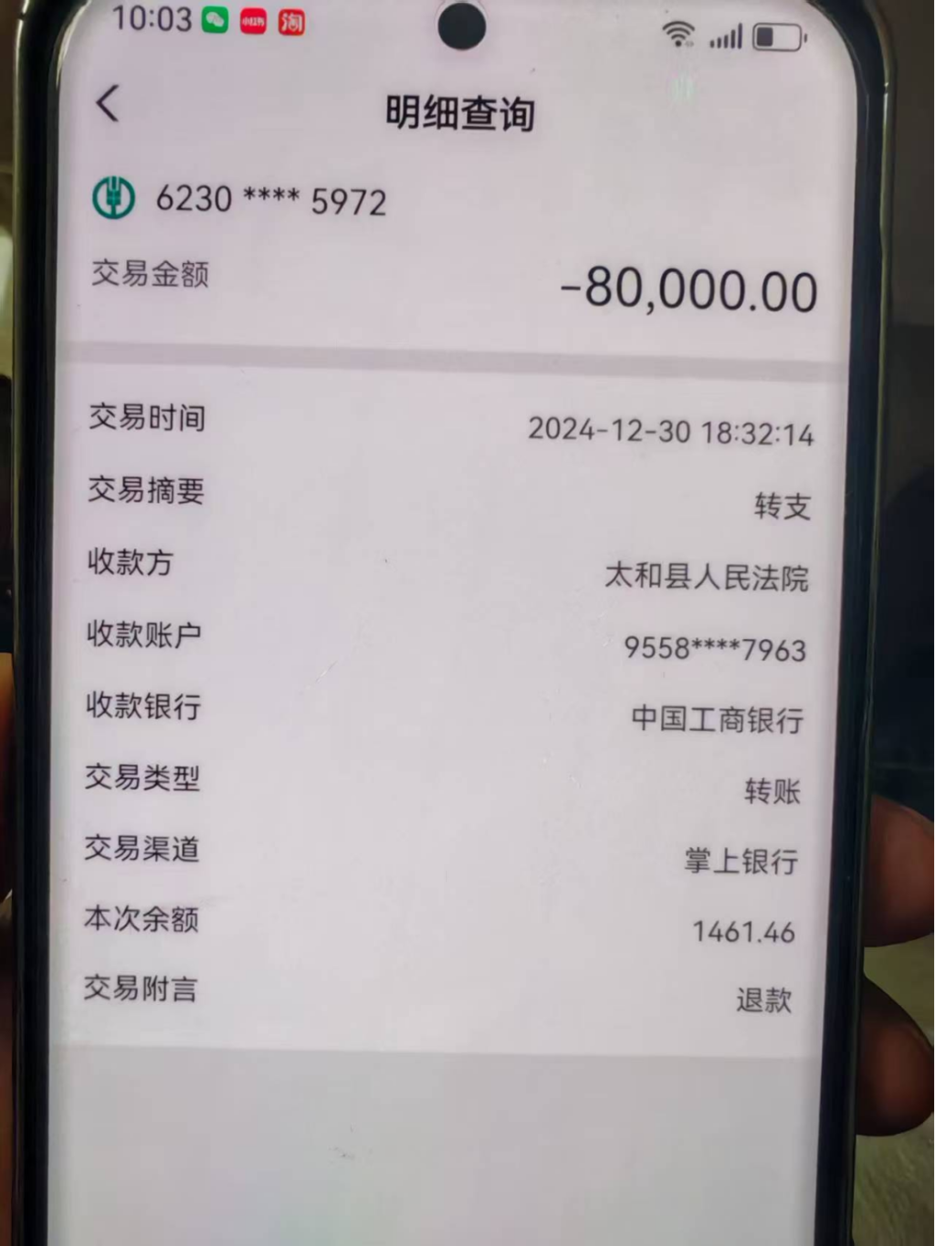 不过同年12月30日,王冰清突然通知陈静“执行错误”,称划扣的是与罪犯同名的另一名“张建民”的账户,要求陈静全额退款。陈静回忆称:“法院说两个张建民身份证号不同,让我看了一眼就收走材料,不让拍照。”当天下午,王冰清和刘晶晶前往陈静母亲的居所,和陈静说了退款的事,并承诺申请司法救助,现场给陈静做了相关申请的表格填写手续。陈静当天退还给法院执行局8万元,剩余款项由于给母亲治病花掉而暂未退回。