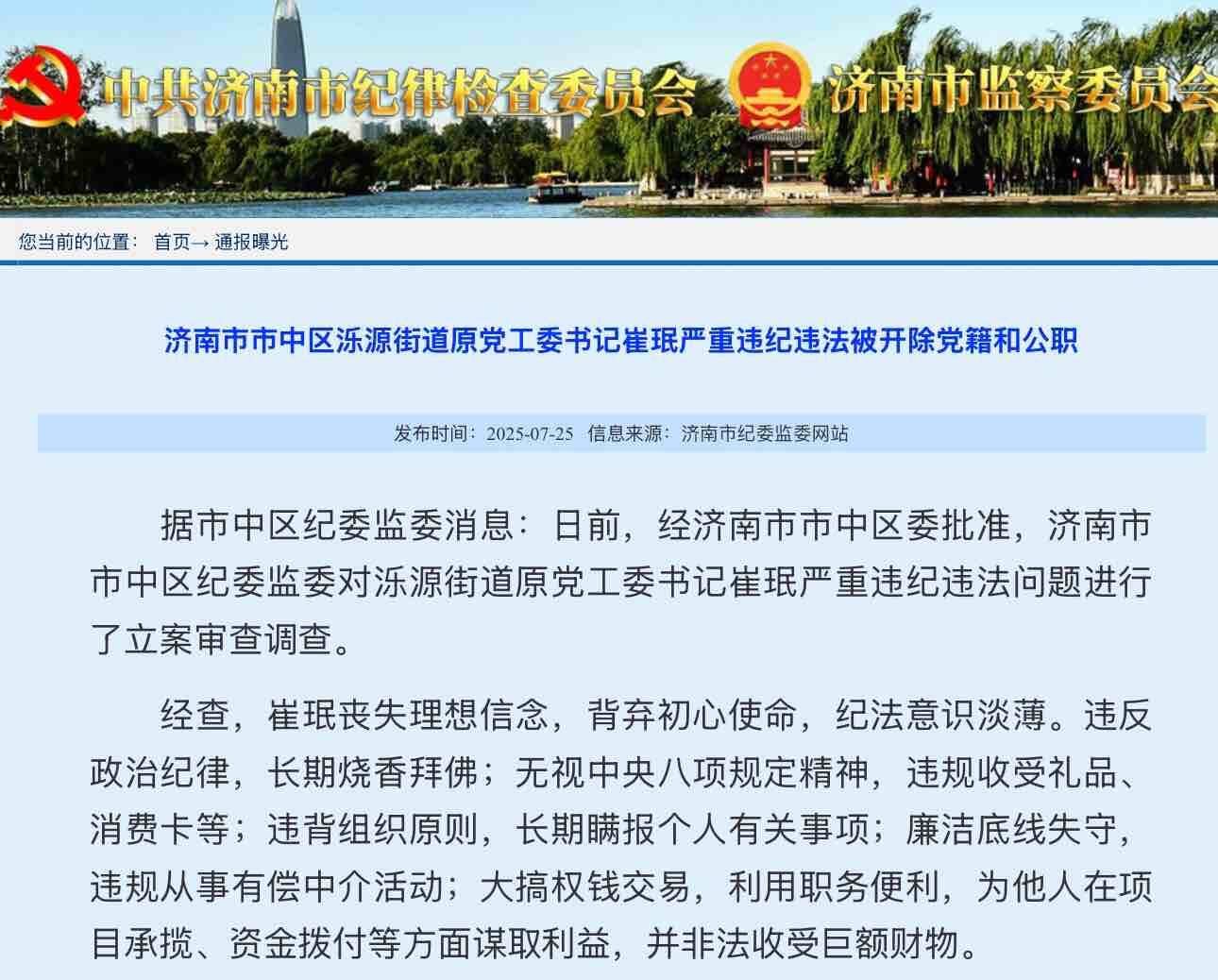 齐鲁网·闪电新闻7月25日讯 记者从济南市纪委监委获悉:日前,济南市市中区纪委监委对泺源街道原党工委书记崔珉严重违纪违法问题进行了立案审查调查。