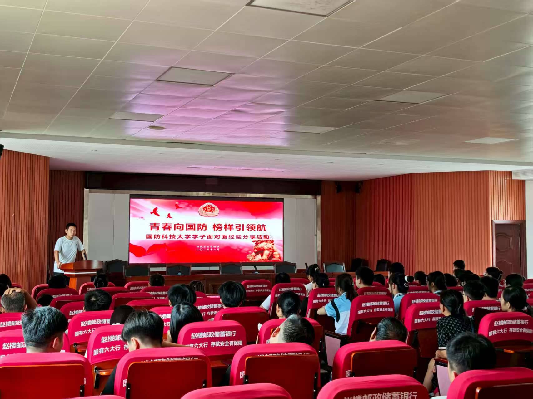 齐鲁网·闪电新闻8月14日讯 为大力弘扬爱国主义精神,持续深化青少年国防教育,引导广大青少年学生筑牢爱国信念,近日,郓城县南赵楼镇武装部特别邀请本乡镇国防科技大学新生王景阳,开展了一场主题为“青春向国防,榜样引领航”的国防教育宣讲活动。南赵楼镇武装部工作人员,来自本乡镇小学、初高中学生及家长70余人参加活动。