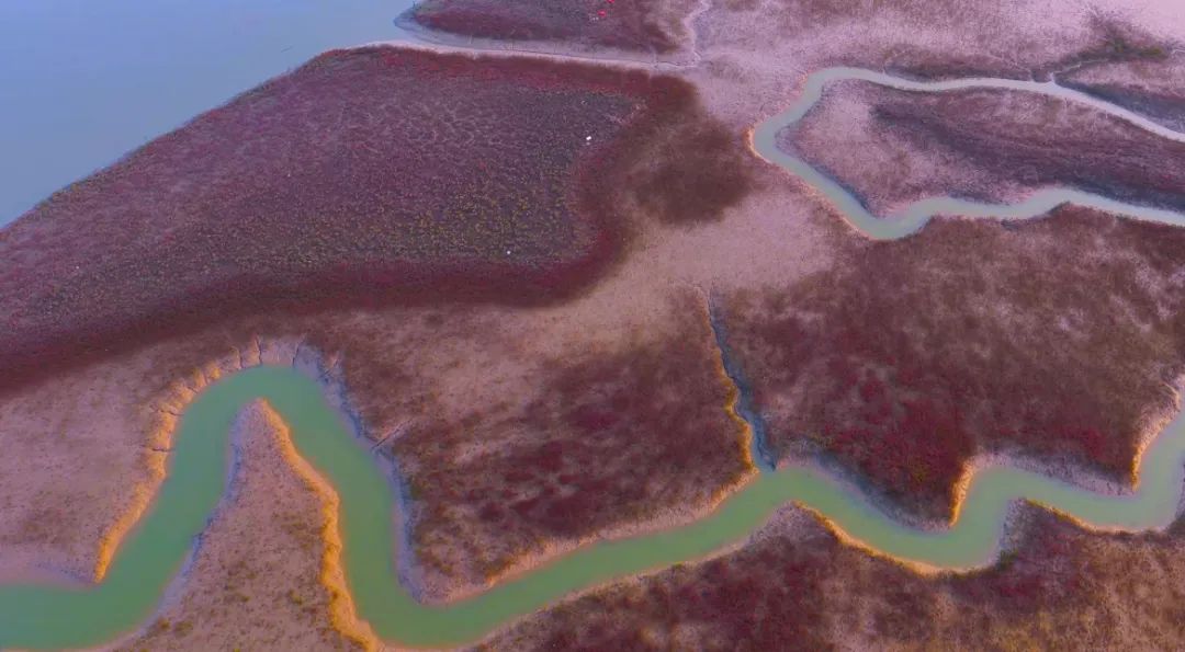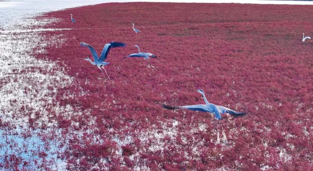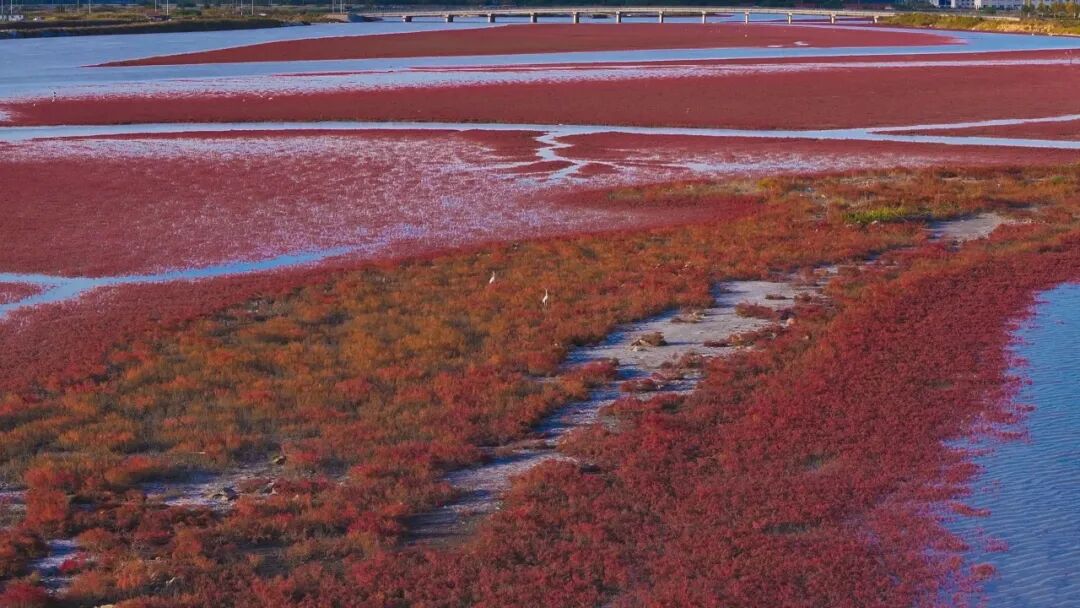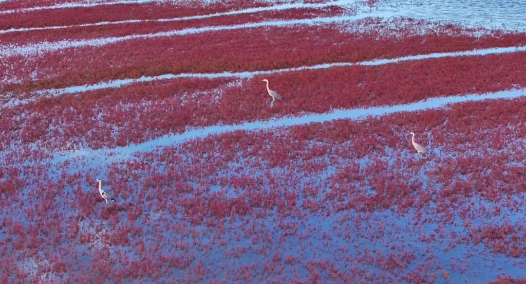 潮起潮落间,滩涂被冲刷出蜿蜒的纹理,宛如“大地之树”的根系舒展,与成片的翅碱蓬相映,形成“潮汐作画、红滩为墨”的奇景。微风拂过,红色草甸泛起涟漪,白鹭、苍鹭不时掠过水面,动静之间,恰似一幅浓墨重彩的夏日生态画卷。