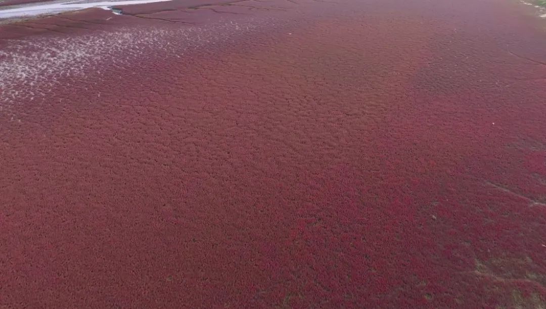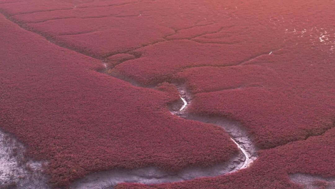 这片红海滩的“主角”是耐盐碱的翅碱蓬。这些扎根滩涂的植物生命力顽强,簇拥生长成连绵的“红色海洋”。