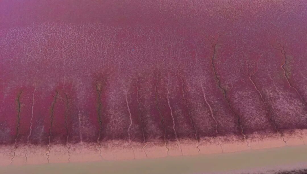 在高温与潮汐的滋养下,翅碱蓬从嫩绿渐变为嫣红,如同一场静默的生命蜕变,在滩涂上铺展出渐变的色彩。