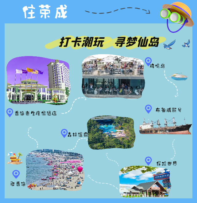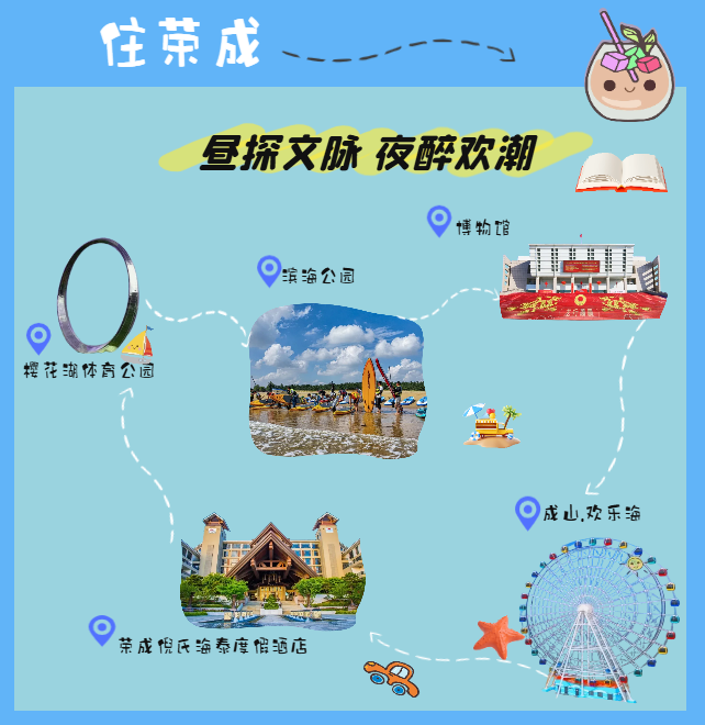 走进荣成博物馆,来一次穿越时空之旅,感受胶东特色渔家文化,深入了解这座“光荣之城”的璀璨历史;在樱花湖体育公园,巨大的“樱花湖之恋”圆环、网红小火车、天鹅巴士都是拍照的最佳背景;一路之隔的滨海公园则是城市亲海的好去处,公园步道蜿蜒于碧海松林间,漫步其中可以感受海滨城市的浪漫脉搏;夜幕降临后的成山·欢乐海,每周末音乐live、灯光秀轮番上演,精彩一“夏”。