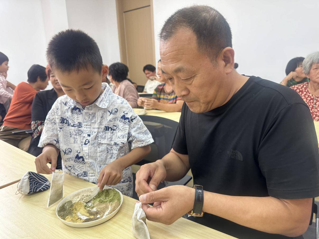 在实践环节,师生团队现场演示香囊制作流程。村民们带着孩子一起动手,称药、研磨、装袋、系绳,每一步都凝聚着对传统文化的热爱。大学生志愿者们耐心指导,手把手教孩子们缝制技巧,活动现场欢声笑语不断。“自己做的香囊既能驱蚊又能安神,比买的更有意义!”南张夼村小朋友王乐乐举着香囊自豪地说。