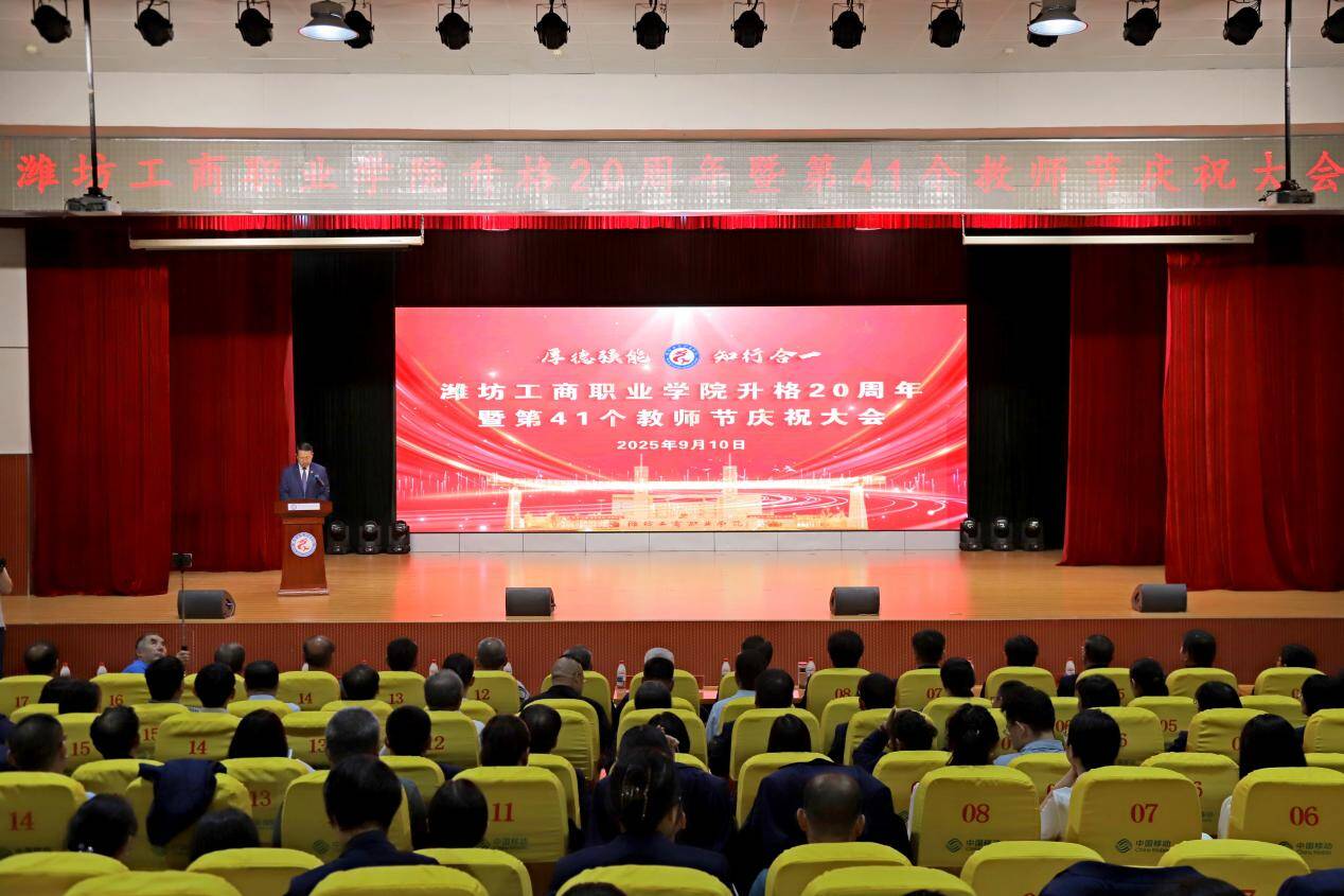 齐鲁网·闪电新闻9月11日讯 9月10日,潍坊工商职业学院隆重举行“升格20周年暨第41个教师节庆祝大会”。学校党政领导、功勋教师代表、优秀校友、在校师生等700余人齐聚一堂,共襄盛会,回顾二十年奋斗历程,展望新时代职业教育发展蓝图。