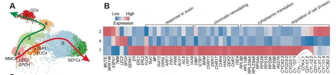 利用先进的单细胞测序、显微切割转录组测序与活体成像等前沿技术,团队完整记录了细胞命运重塑的完整路径,揭示了关键的命运分岔点:一条路径是气孔前体细胞继续分化为气孔;另一条路径是在大量合成内源生长素的推动下,单个体细胞被重编程为全能干细胞,走上胚胎发育之路。