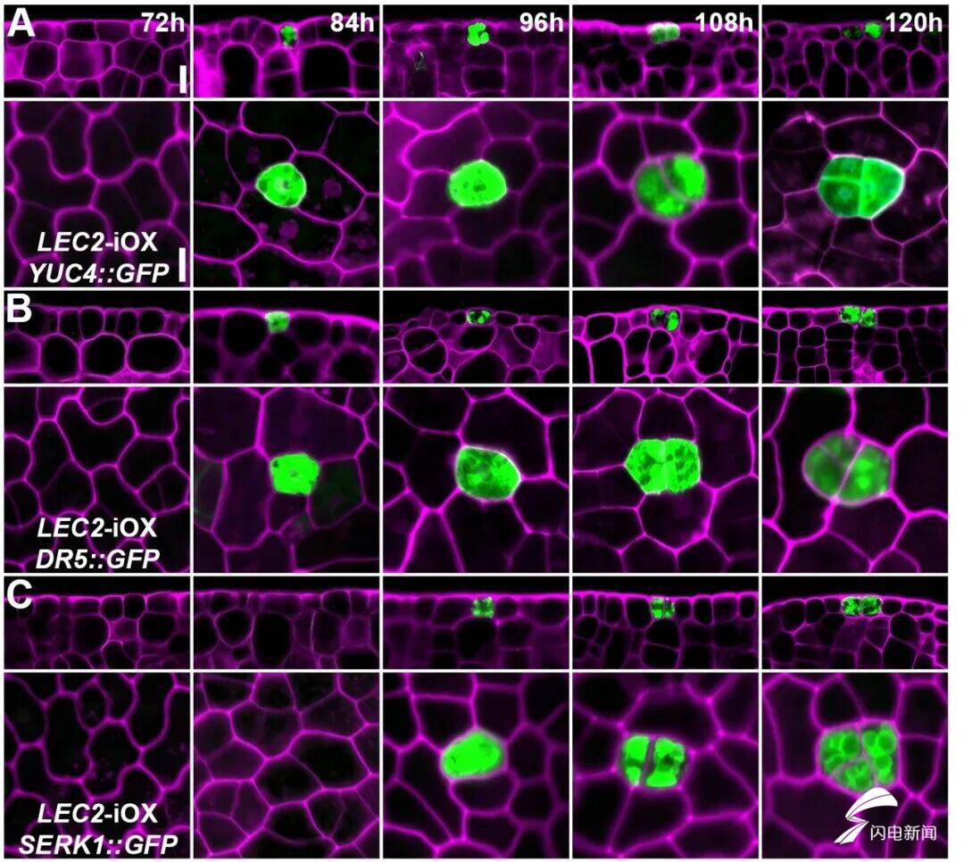 团队通过深入研究,找到了触发细胞全能性的“关键钥匙”:叶片气孔前体细胞特有的基因SPCH,与人工诱导高表达的基因LEC2,二者协同作用形成“分子开关”。“就像转动一把锁需要两把钥匙,缺一不可。”张宪省教授形象比喻。