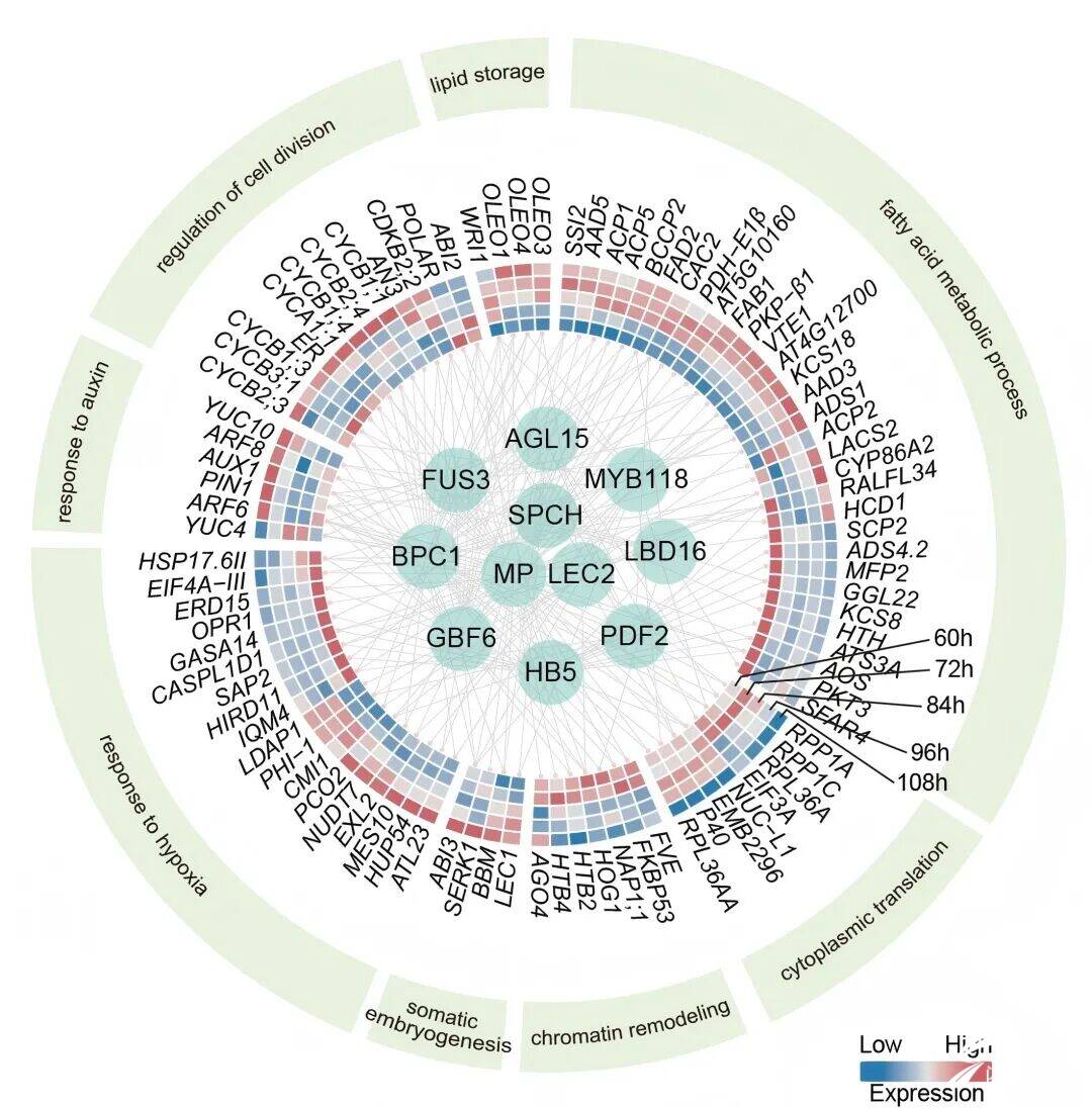 更为重要的是,该研究在世界上首次全面解析了单个植物体细胞重编程形成全能干细胞并再生完整植株的分子机理:在GMC-auxin中间态下,大量转录因子形成高度耦合的调控网络,进而激活下游的胚胎发生程序。