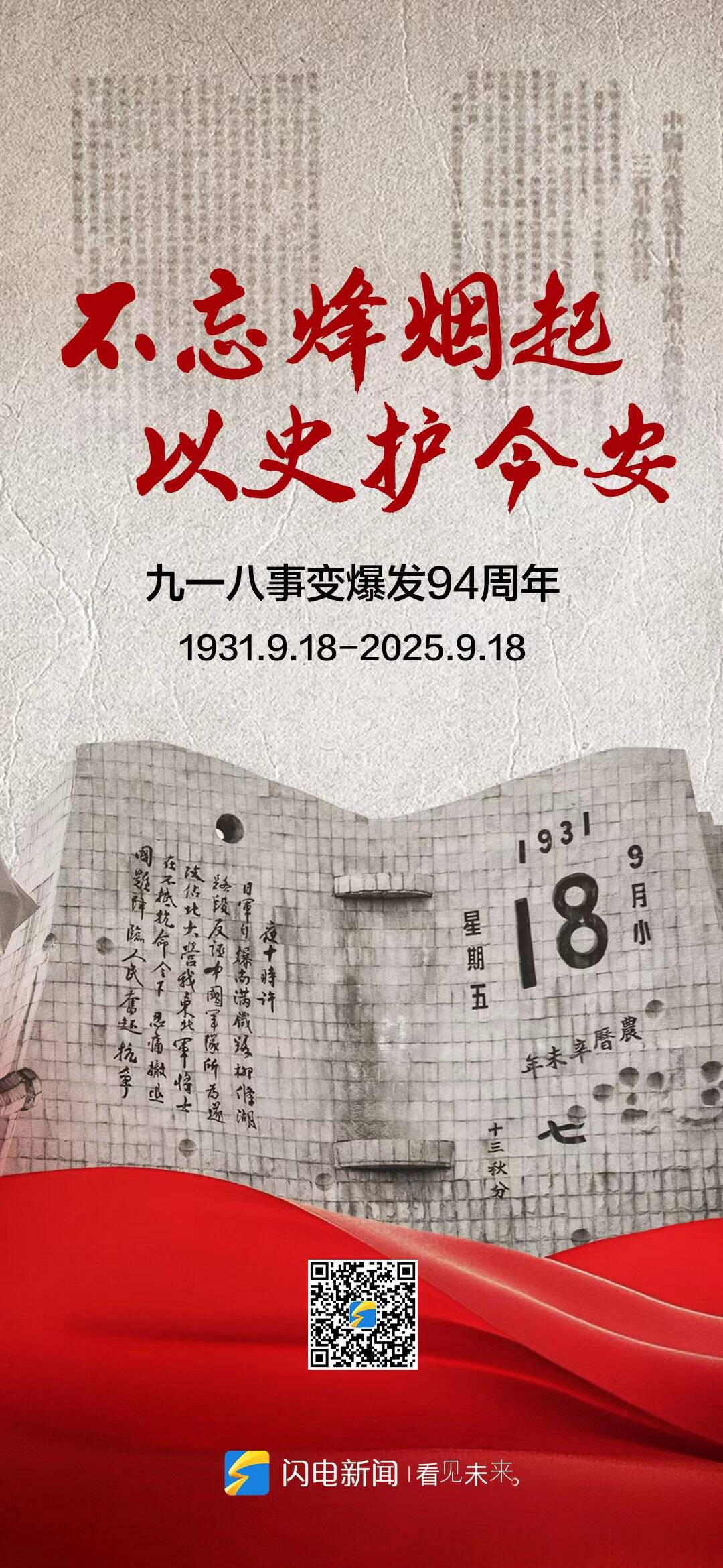 >>>今天是“九一八事变”94周年。1931年9月18日,震惊中外的九一八事变爆发,日本军国主义开始了长达14年的侵华战争,在14年艰苦卓绝的抗日战争中,无数国人用热血铸就了伟大的抗战精神,硝烟散去,警钟长鸣,让我们一起悼念同胞、缅怀先烈,提醒后人勿忘国耻,砥砺前行。