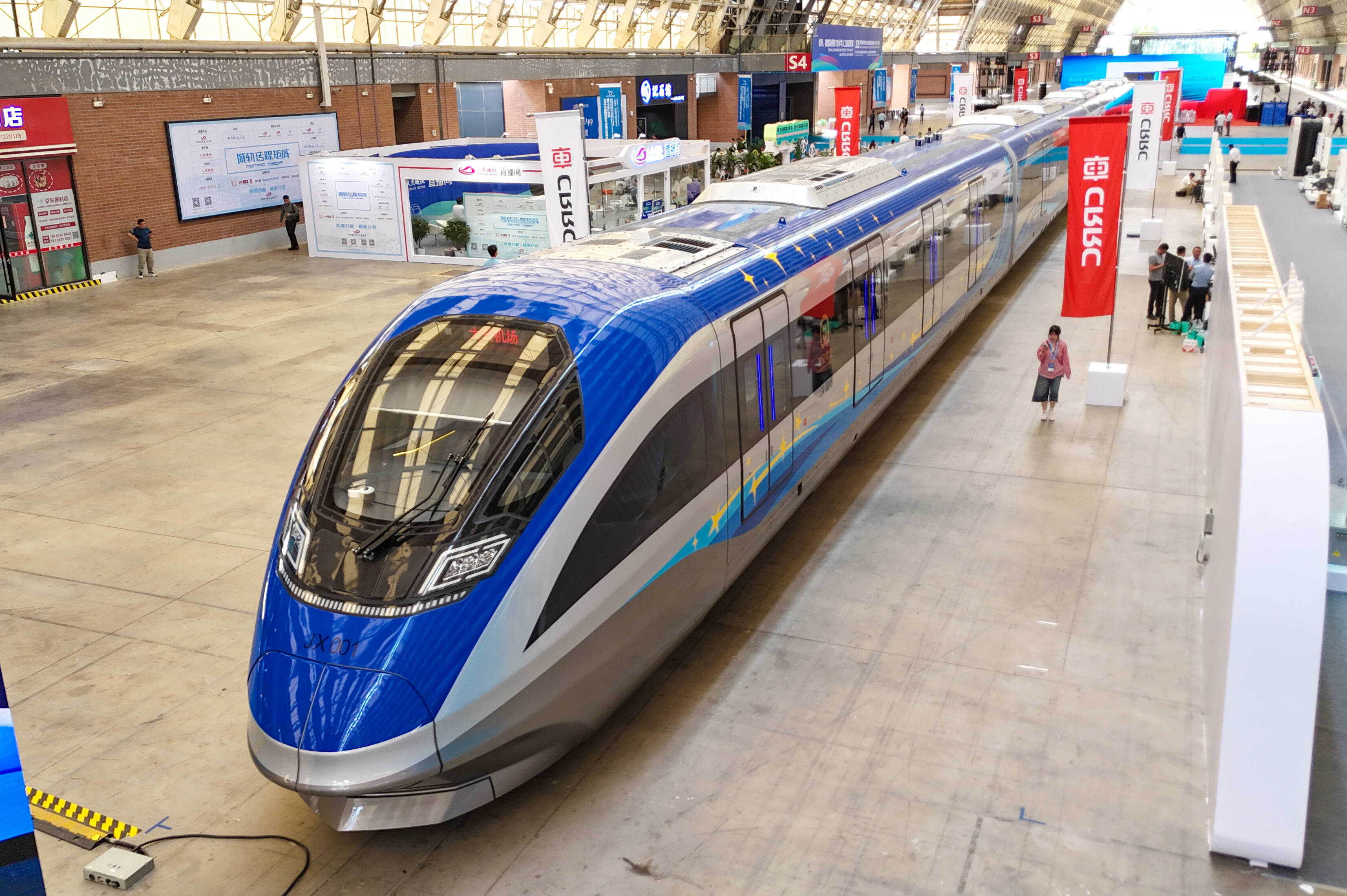 一名参会者从智能市域列车旁边走过。