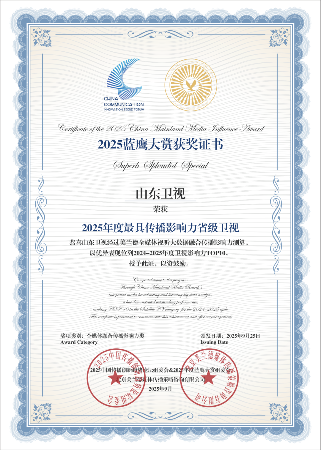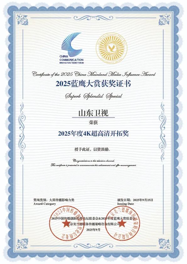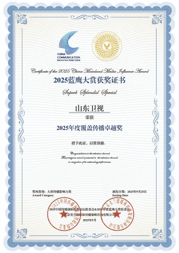 山东卫视斩获“2025年度最具传播影响力省级卫视”大奖。该奖项综合评估省级卫视在全网媒体曝光、社交用户热议、频道及内容美誉度等维度,旨在表彰本年度融合传播成果显著的十大省级卫视,是衡量省级卫视全媒体传播力和影响力的巅峰荣誉。山东卫视不仅在媒体曝光上屡创佳绩,赢得了广大观众的瞩目与喜爱;更在网民评议中收获了如潮的好评,美誉度持续攀升,彰显了其在卫视领域的深厚底蕴与非凡实力。
