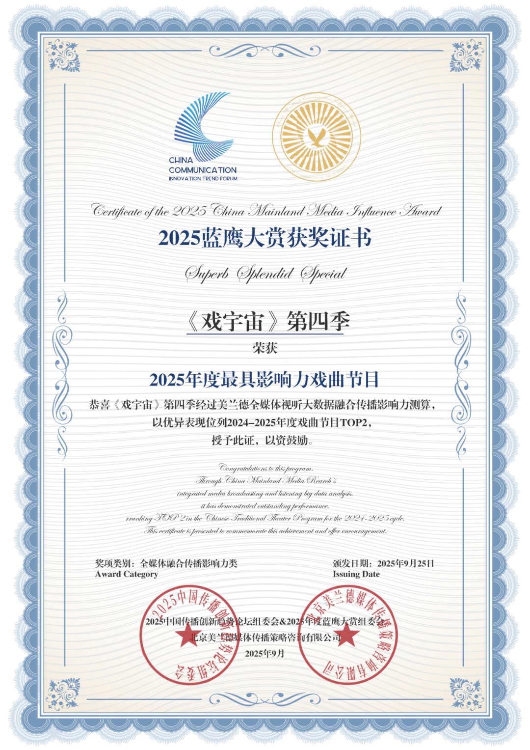 《戏宇宙》第四季获“2025年度最具影响力戏曲节目”。